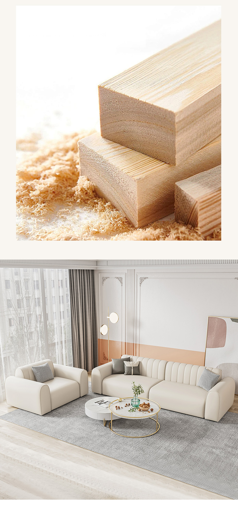 云端 奶油风 羊羔绒布料+抛光实木内架+合成板材框架+坐包填充高密度纯海绵+5公分实木圆脚 米白色 2.7米四人位+圆凳¥5387