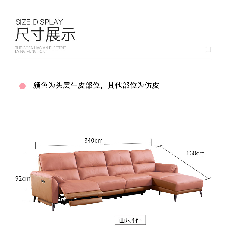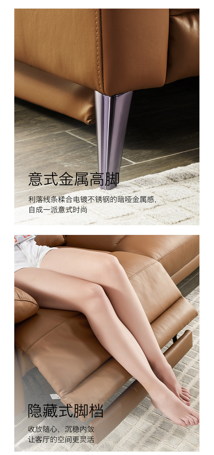 甄品家具 现代简约 接触面进口头层牛皮+进口 落叶松+高 回弹海绵+高承重碳 钢功能架+零靠墙锐迈电机+单电动功能 碳素钢脚 3米 三人位 单电动功能沙发
