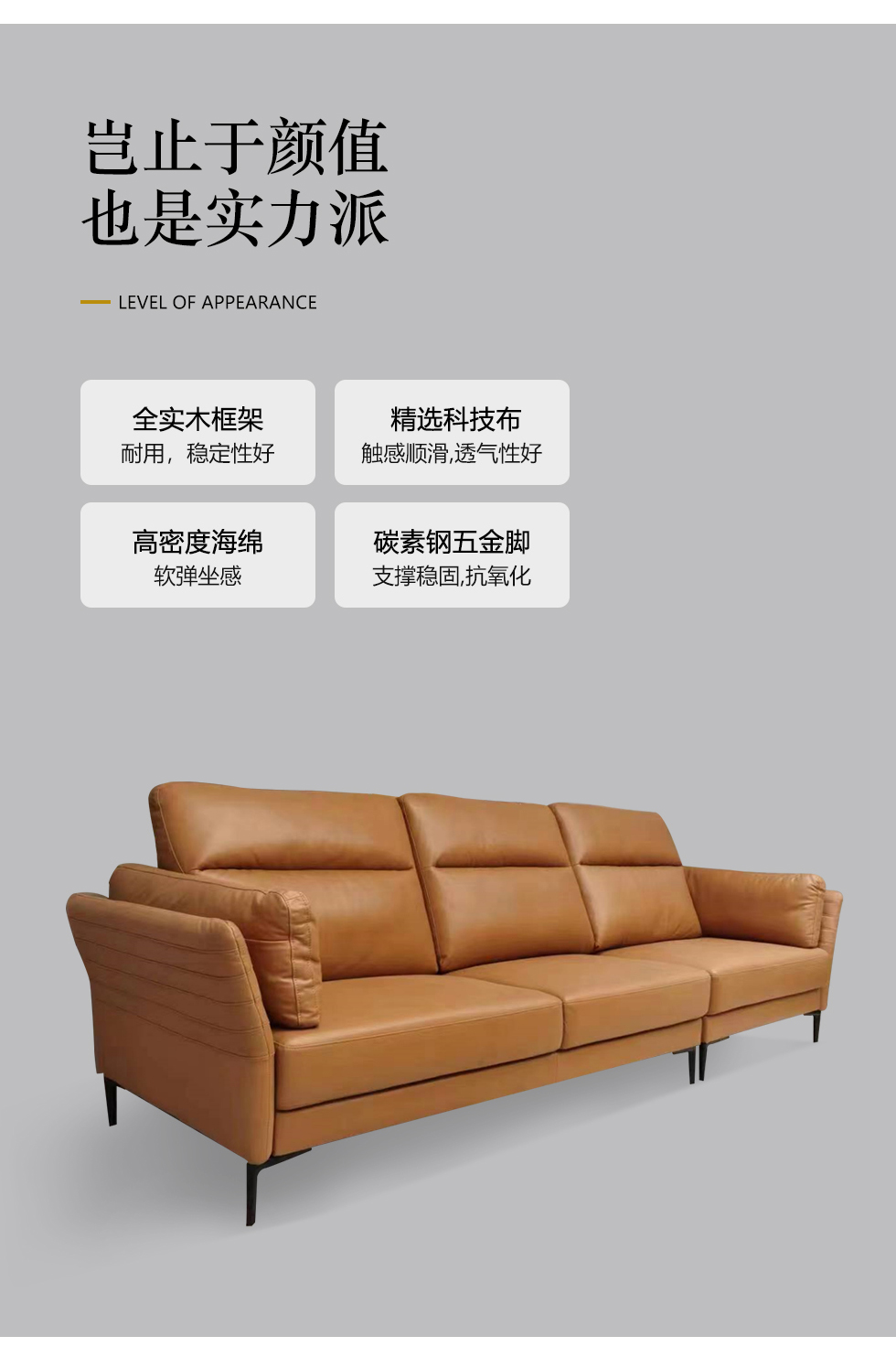左右家居 现代简约 接触面头层牛皮+仿真皮+实木内架+多层实木板+高回弹海绵+碳素钢五金 四人位2.64米沙发¥9763