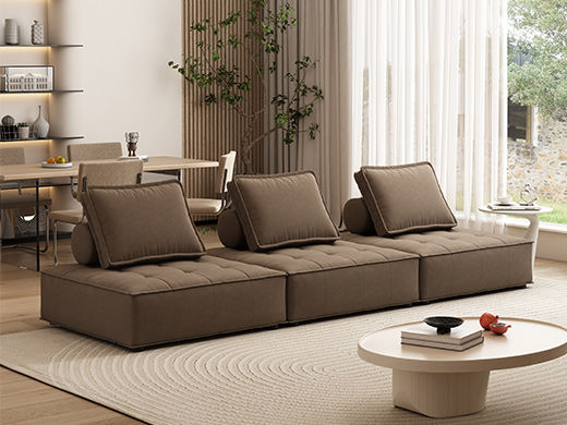 非凡工艺 现代简约 猫传绒布+全实木内架+多层实木板+高回弹海绵+5公分实木圆脚 咖色 直排 布艺网红3.24米沙发