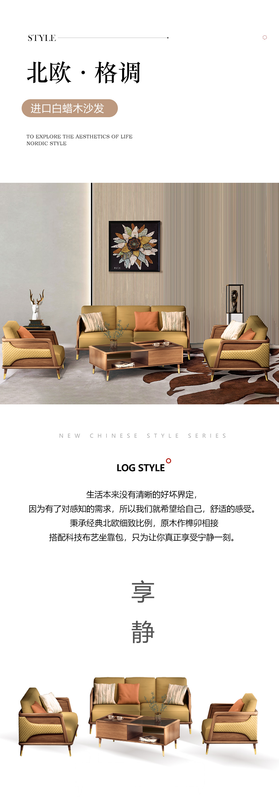 简森曼 北欧风 科技绒+扶手坐板背架为橡胶木 座板下两条托方为松木 原木色 4人位+ 脚踏 【实木拼接工艺】 3.3米沙发¥23286