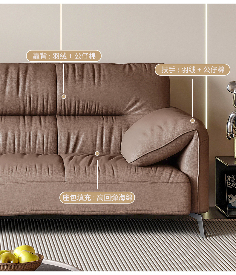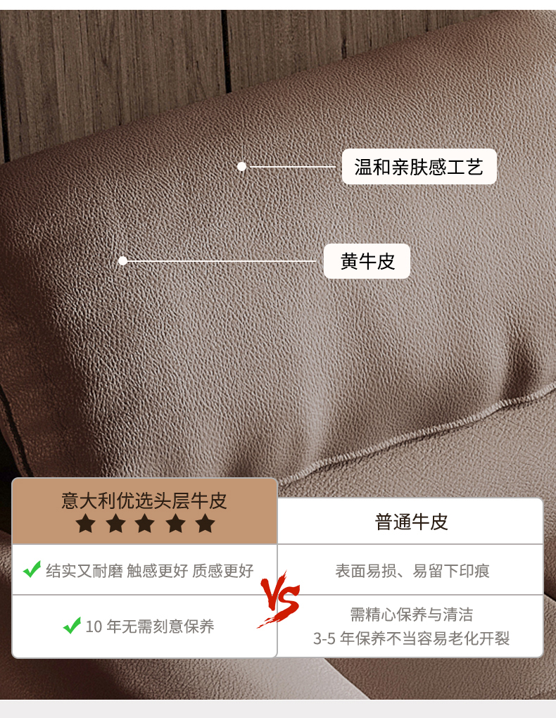 B系优选 现代简约 接触面头层黄牛皮+仿皮+E1级夹板+松木框架+无粉高密度海绵+扶手包公仔棉填充 2.8米 四人位 真皮沙发