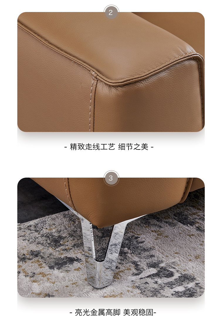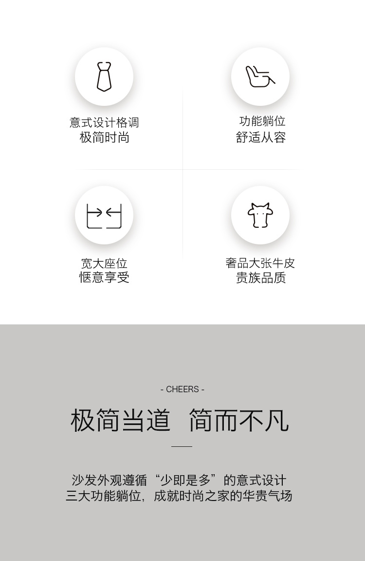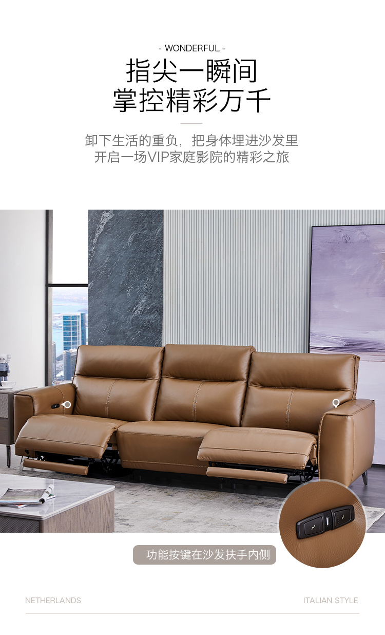 甄品家具 现代简约 接触面进口头层牛皮+进口 落叶松+高 回弹海绵+高承重碳 钢功能架+零靠墙锐迈电机+单电动功能 碳素钢脚 3米 三人位 单电动功能沙发