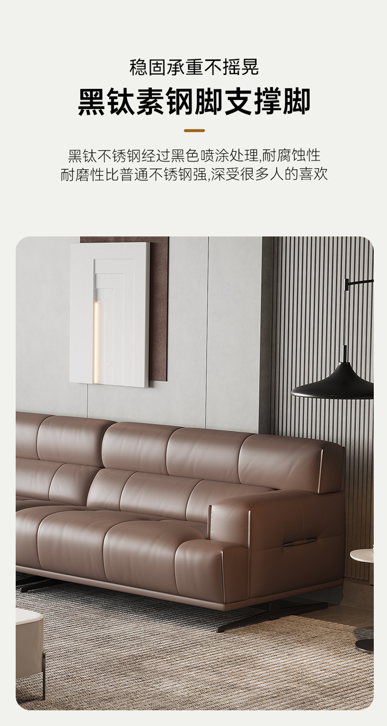 A家家居 现代简约 接触面进口头层黄牛皮(半皮座前真皮)碳素钢工字脚45密度海绵 3.00米直排沙发