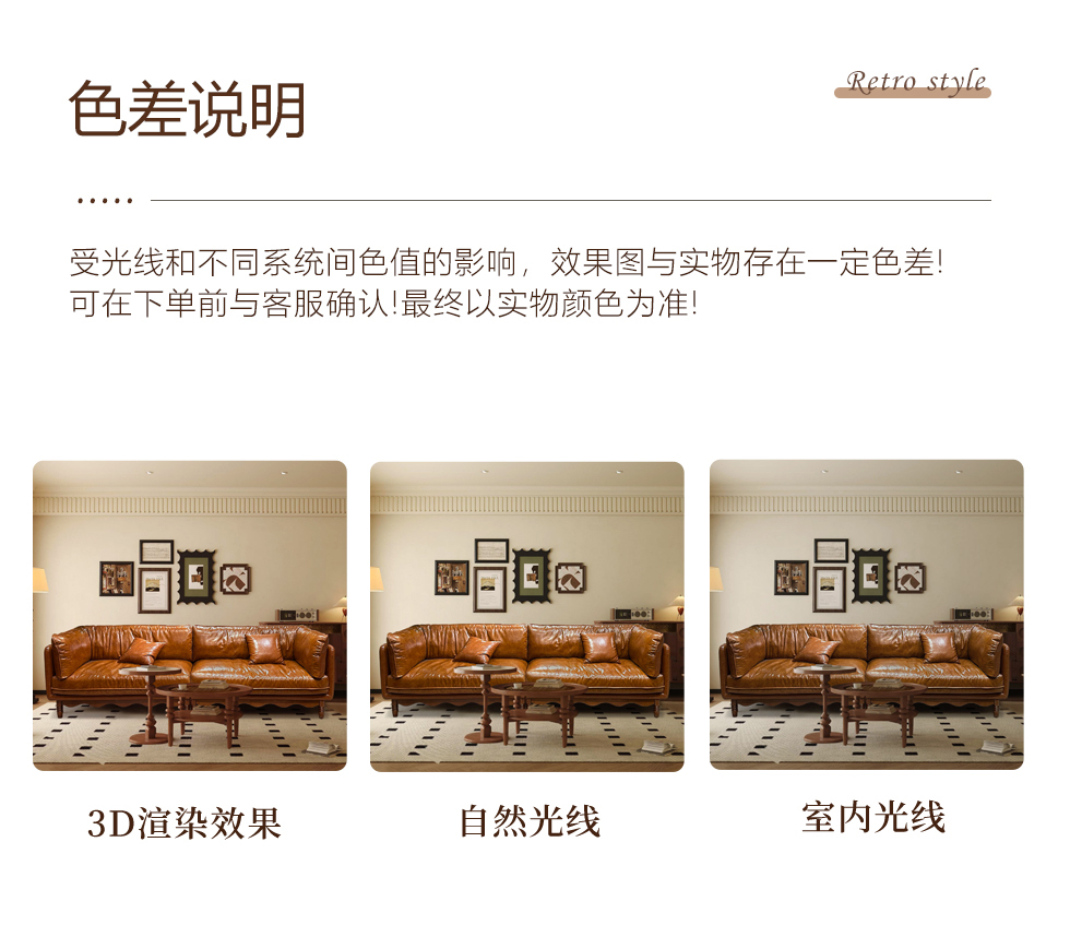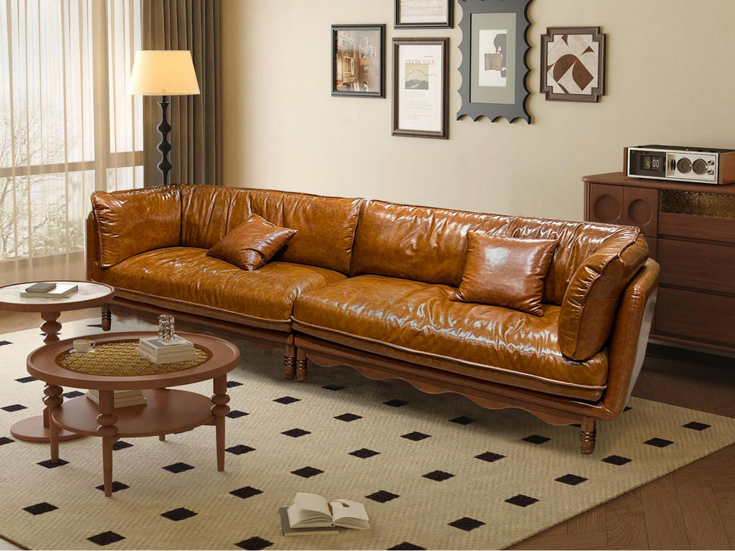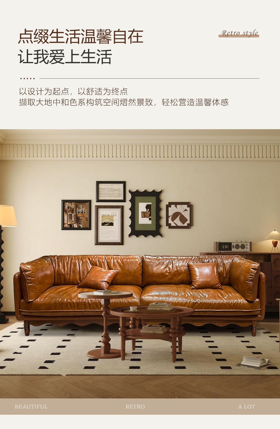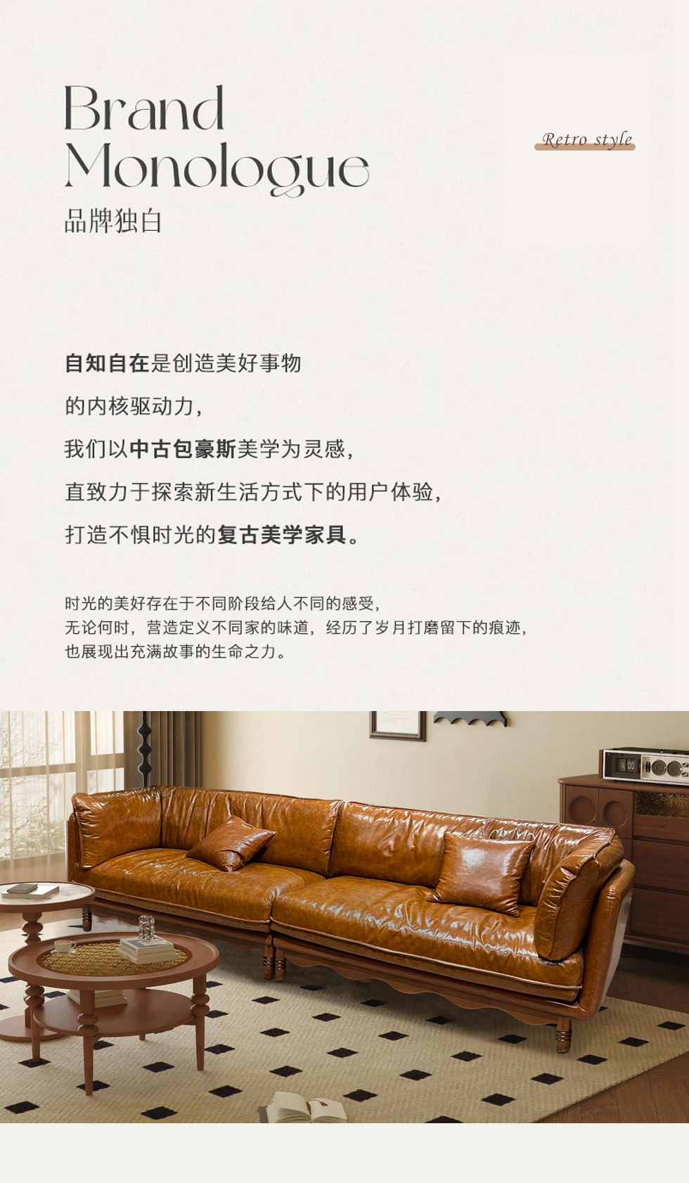 中古·尚 网红 中古风 接触面头层牛皮+框架落叶松木+多层实木夹板+实木脚 2.85米四人位 分体 沙发