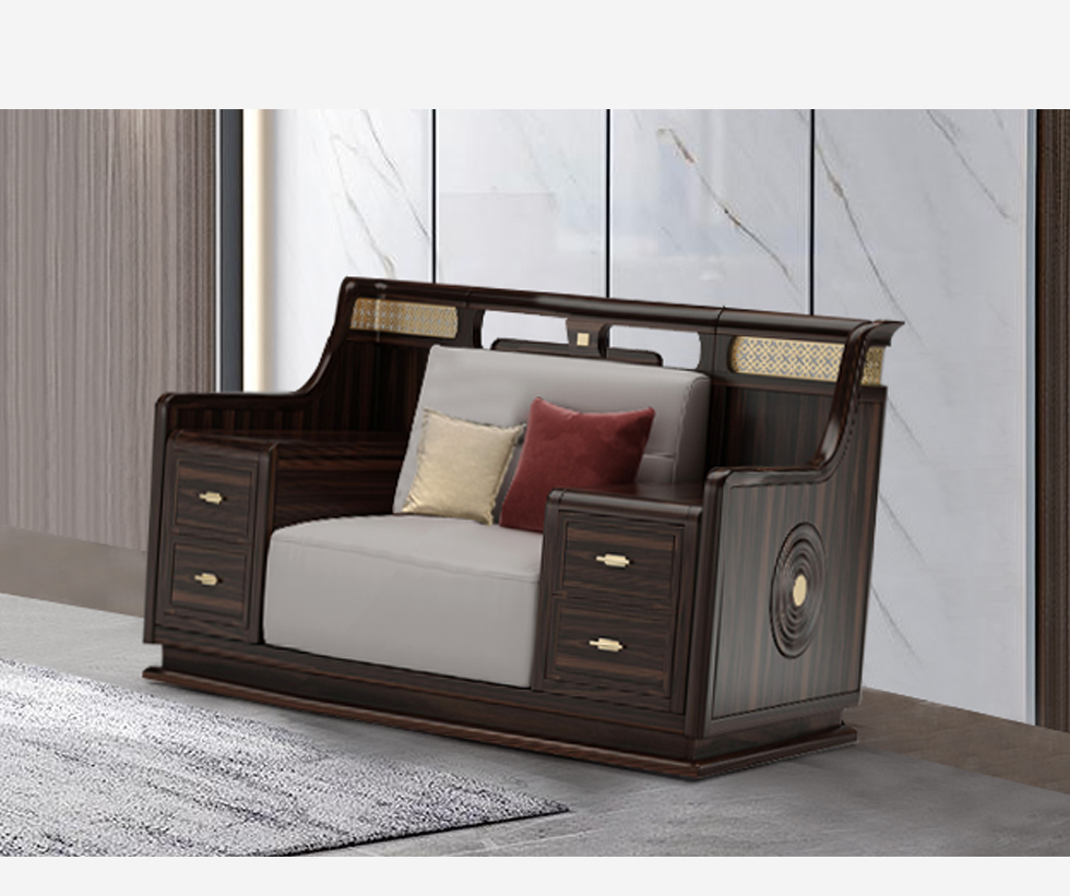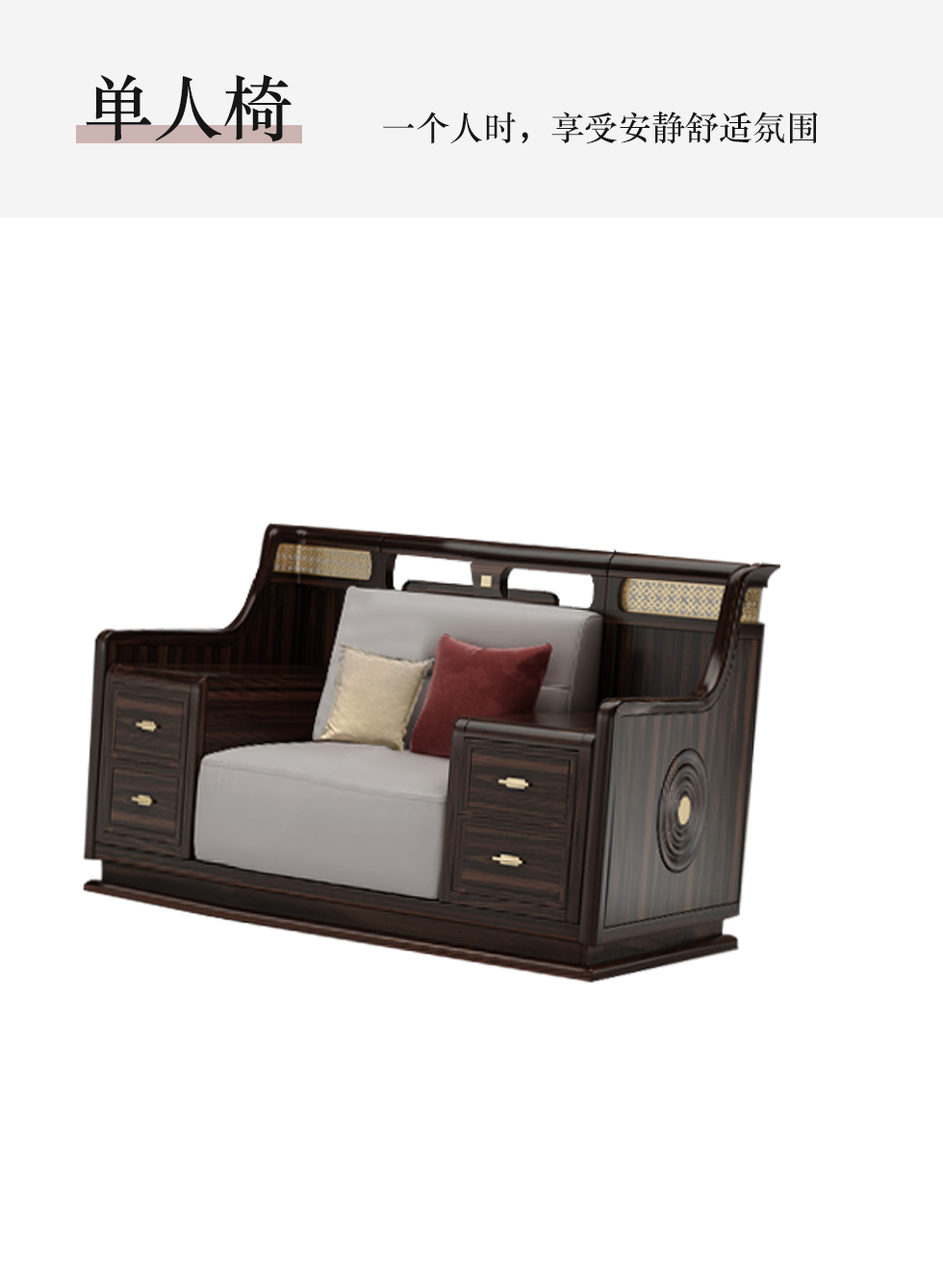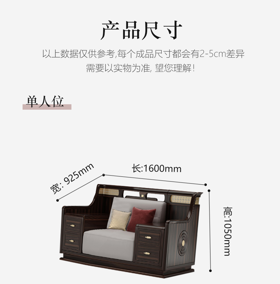 美檀家居 新中式 进口黑檀木+仿真皮+高回弹海绵+多层实木板+电镀五金 黑檀色 单人位 1.6米沙发