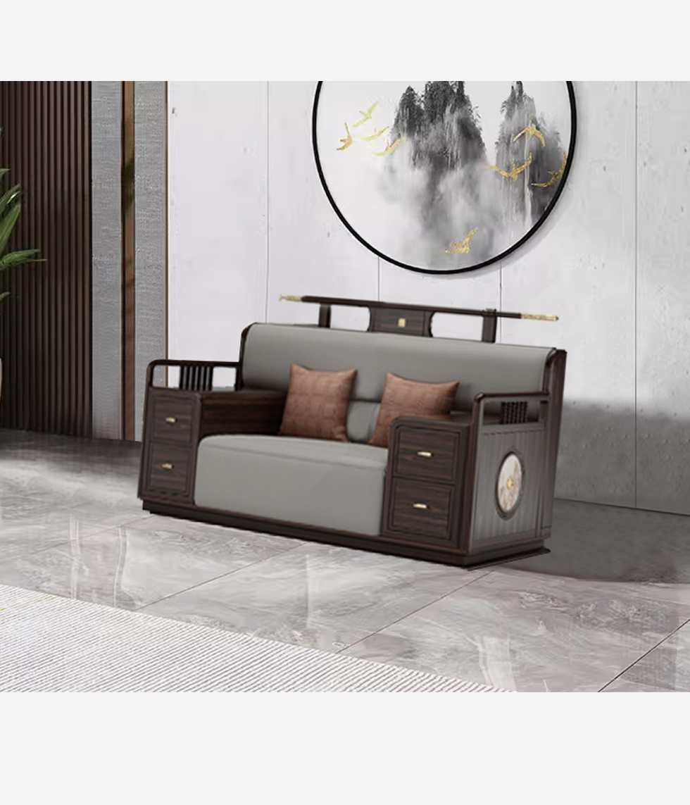 宝瑞·檀风 新中式 印尼金花梨木框架+多层实木板贴皮+布艺 紫檀色 2+2+脚踏 3.3米沙发¥27597