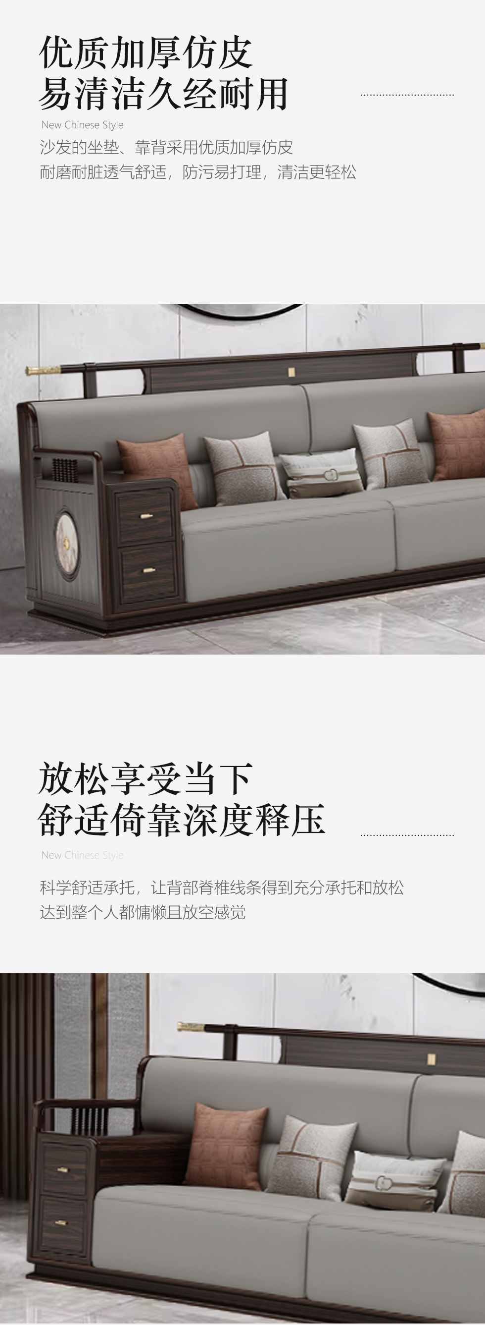 美檀家居 新中式 进口黑檀木+仿真皮+高回弹海绵+多层实木板+电镀五金 黑檀色 三人位 2.7米沙发