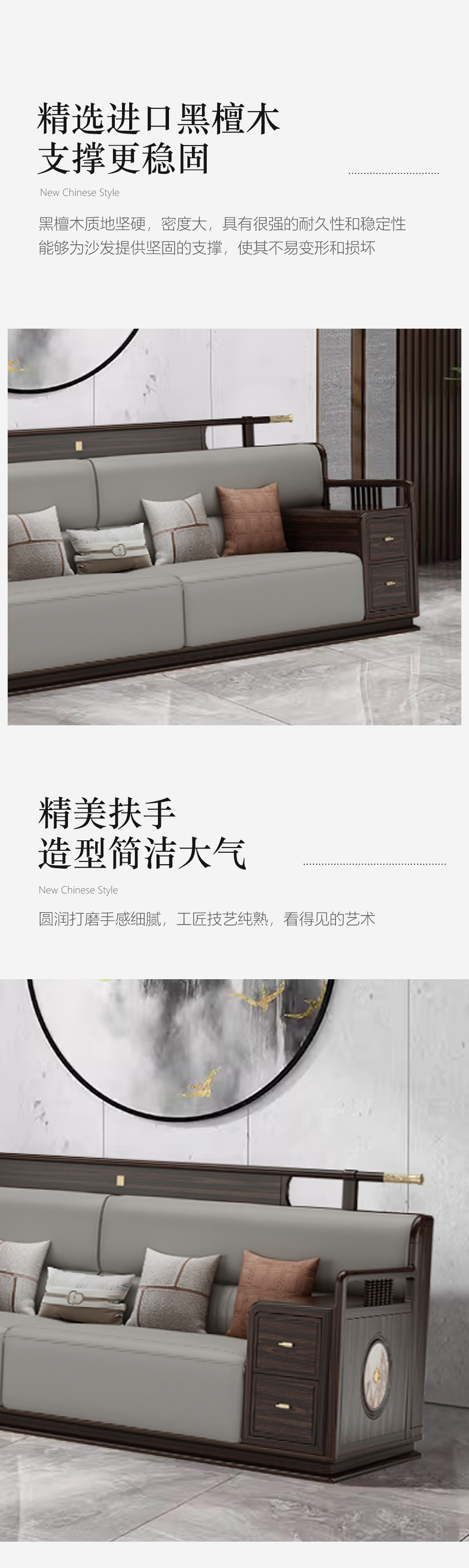 美檀家居 新中式 进口黑檀木+布艺+高回弹海绵+多层实木板+电镀五金 图片色 1+2+3 沙发¥13495