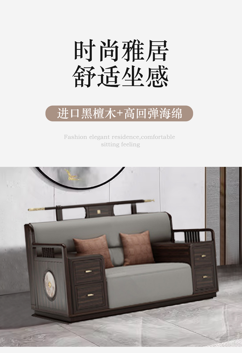 美檀家居 新中式 进口黑檀木+布艺+高回弹海绵+多层实木板+电镀五金 图片色 1+2+3 沙发¥41851