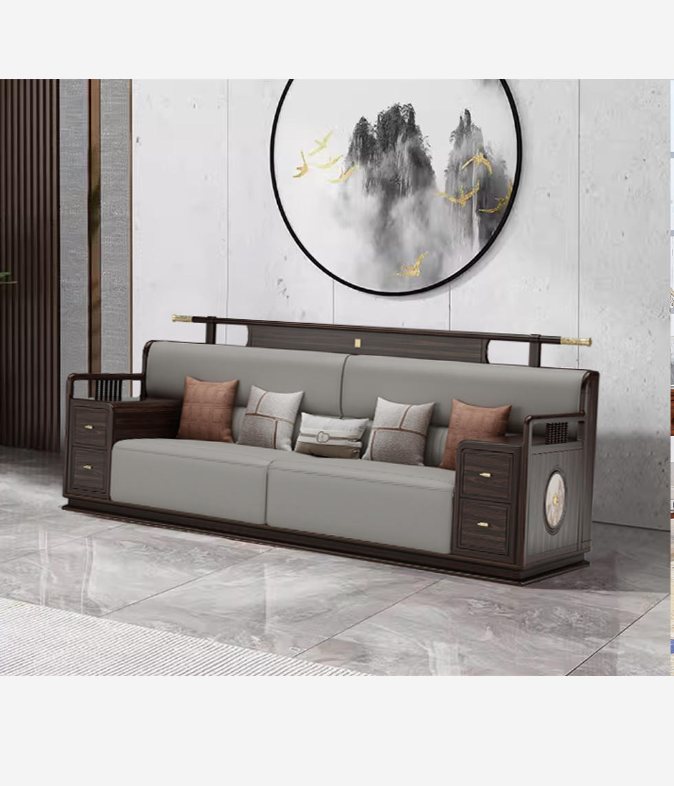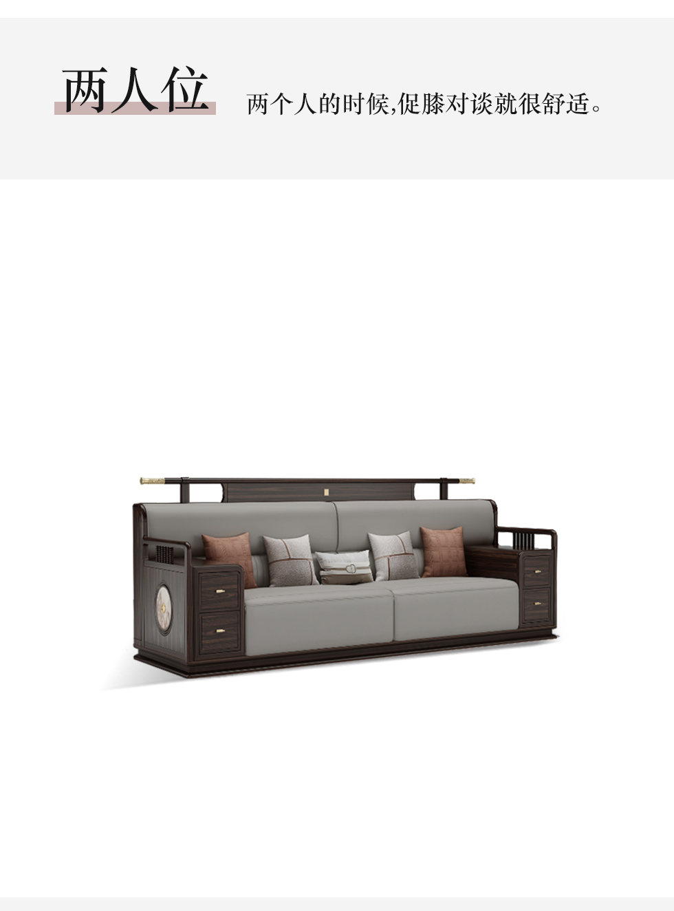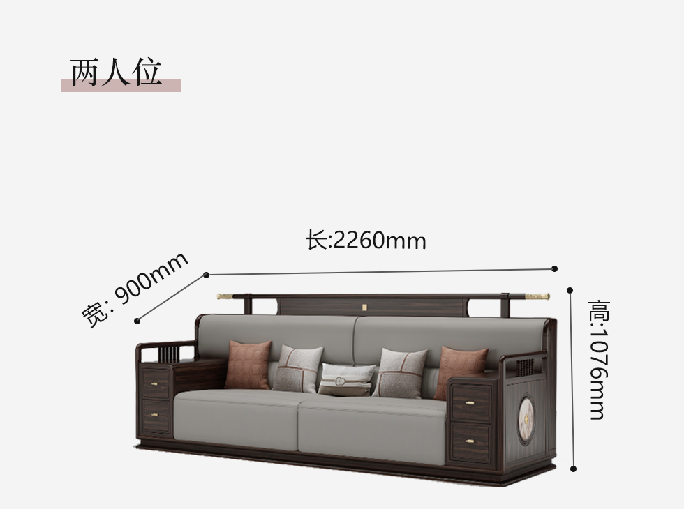 美檀家居 新中式 进口黑檀木+仿真皮+高回弹海绵+多层实木板+电镀五金 黑檀色 两人位 2.26米沙发 |