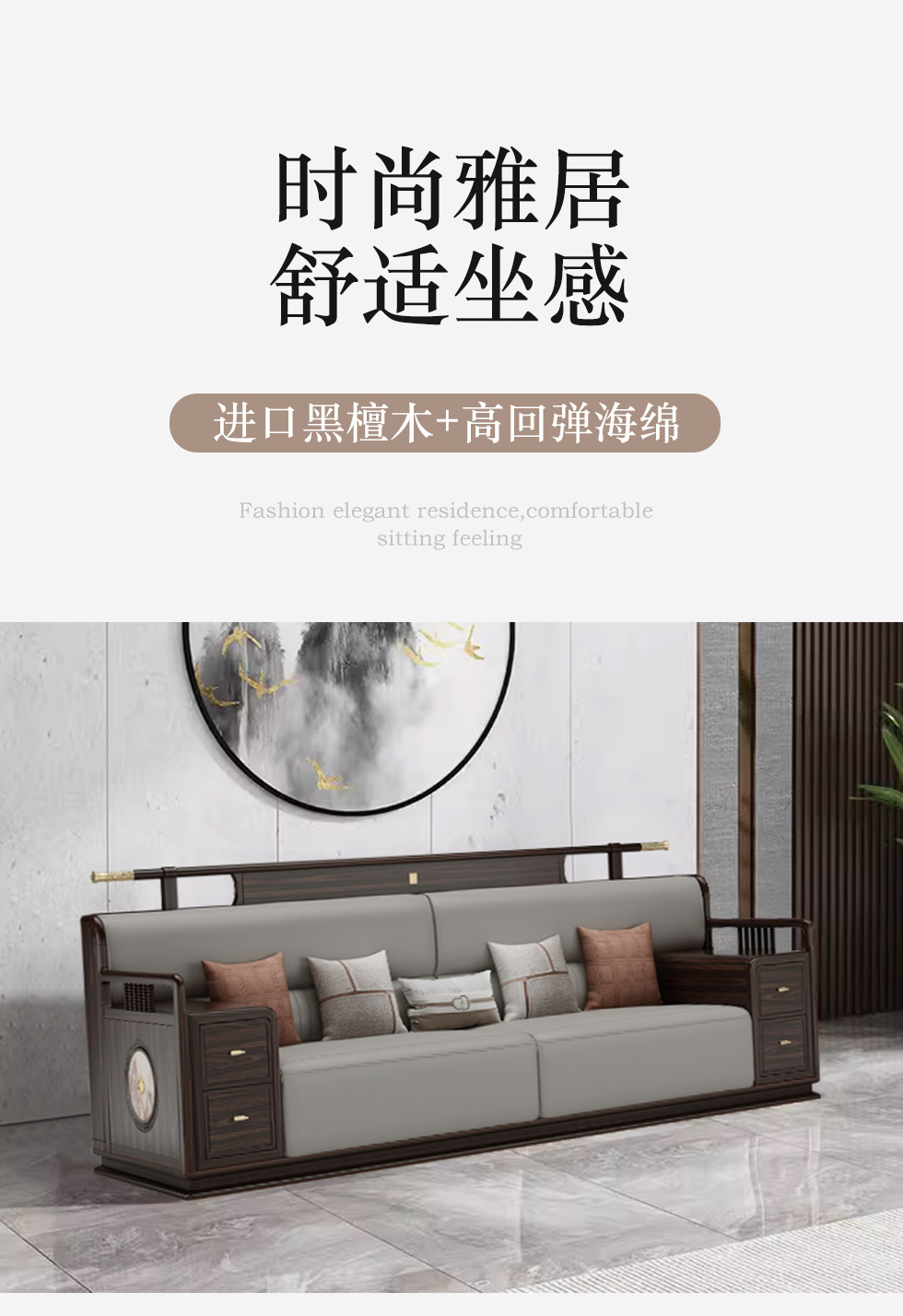 美檀家居 新中式 进口黑檀木+仿真皮+高回弹海绵+多层实木板+电镀五金 黑檀色 三人位 2.7米沙发