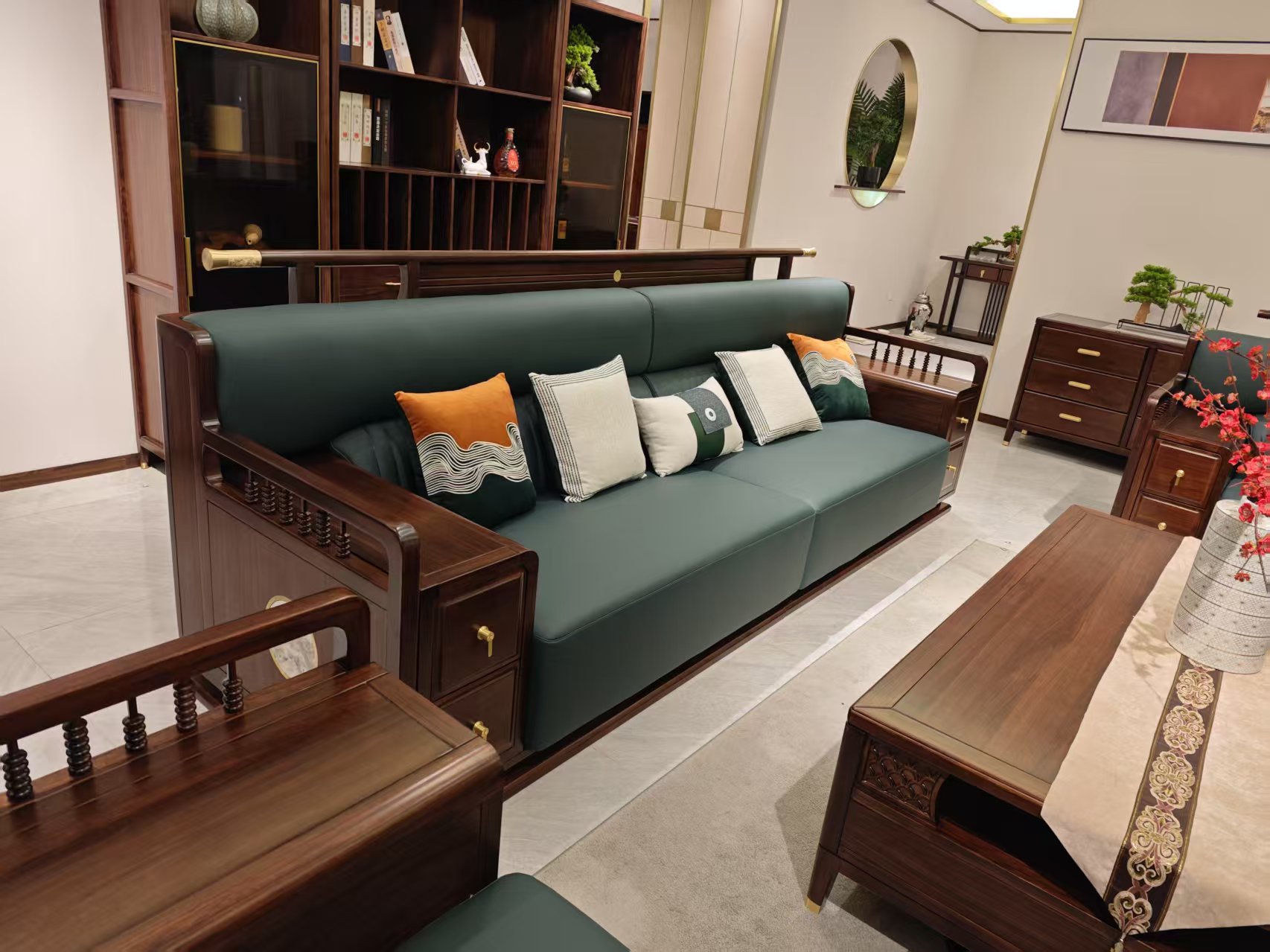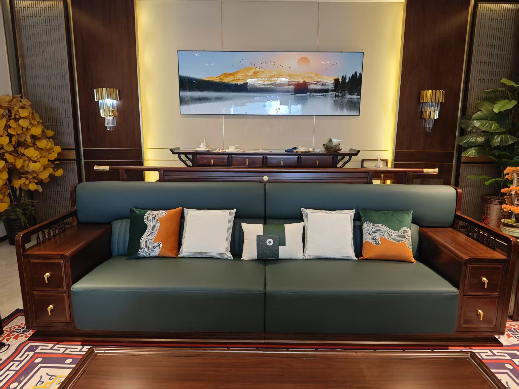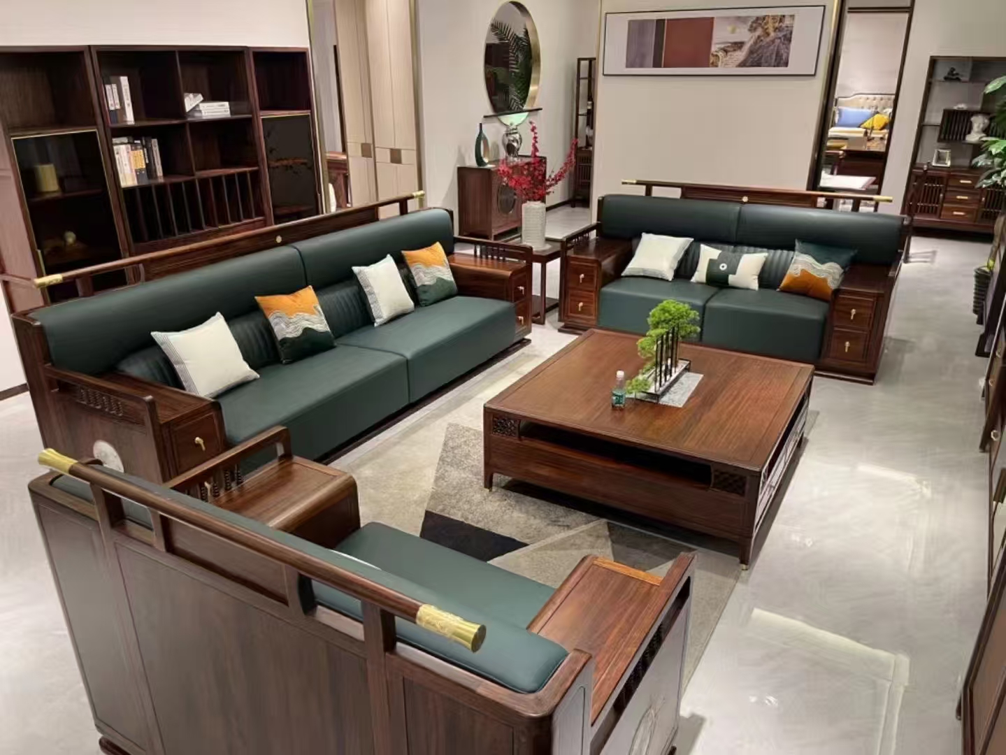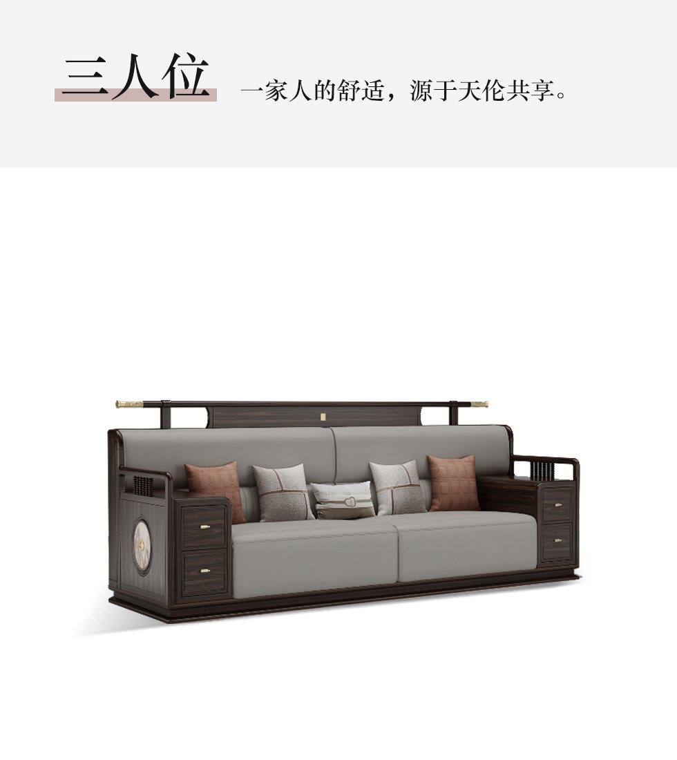 美檀家居 新中式 进口黑檀木+仿真皮+高回弹海绵+多层实木板+电镀五金 黑檀色 三人位 2.66米沙发