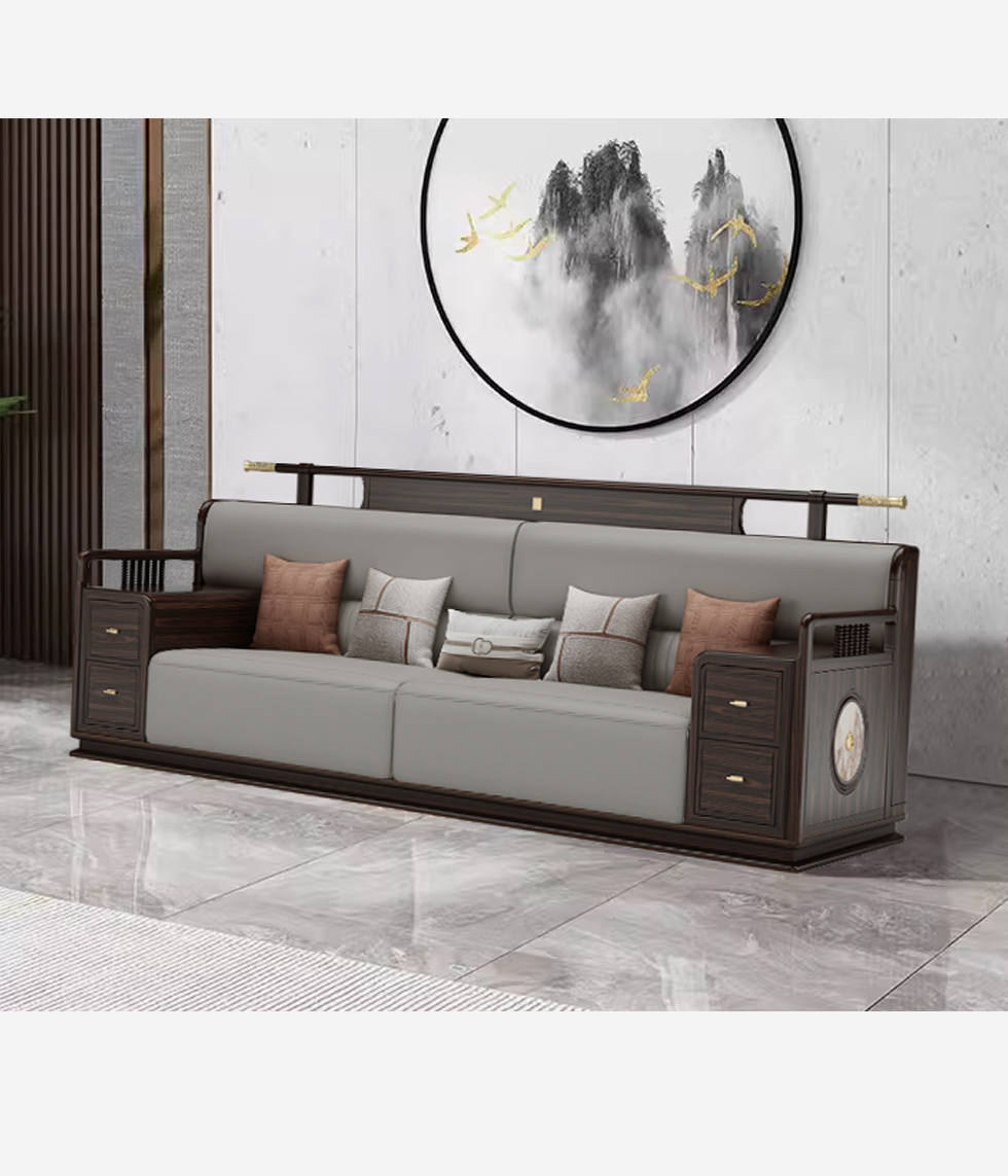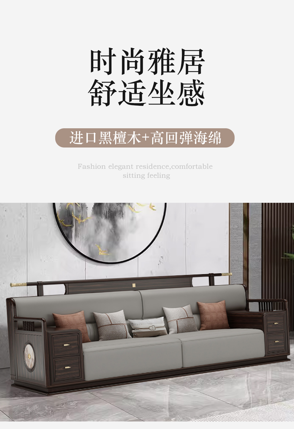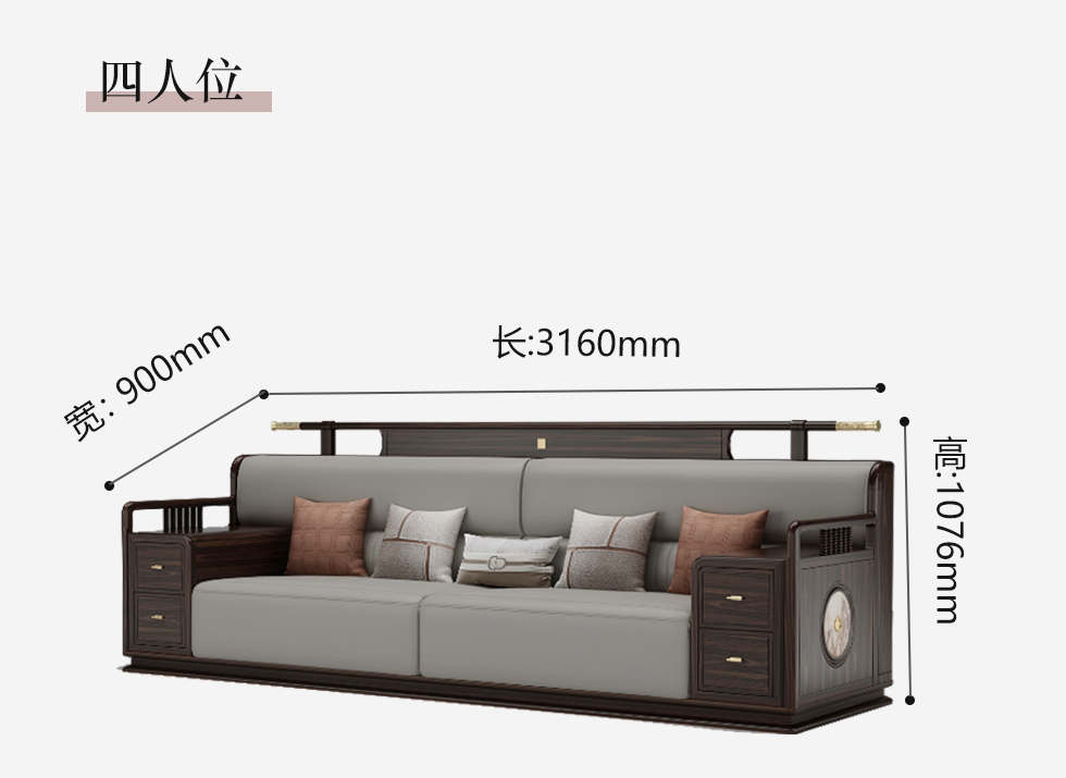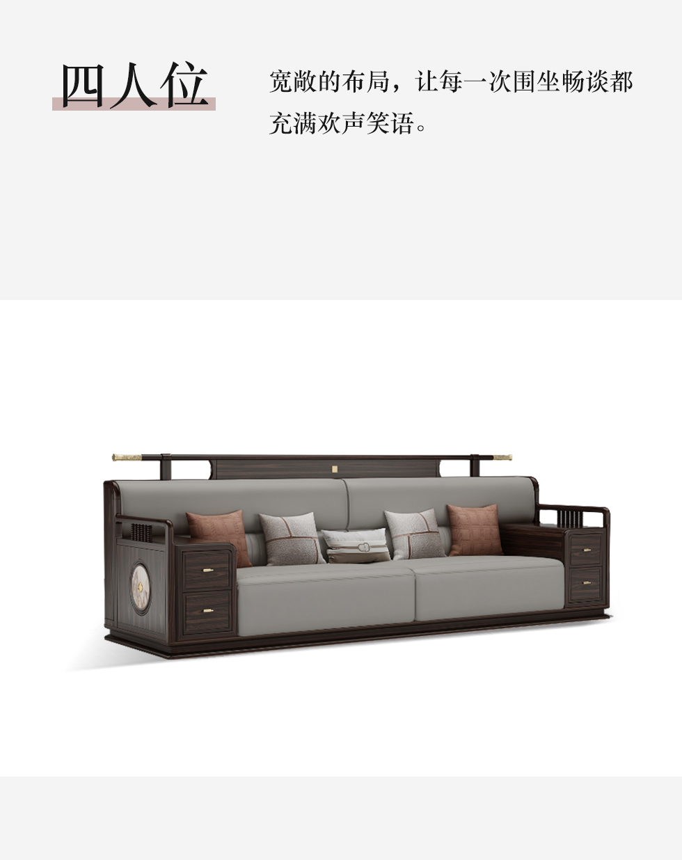 美檀家居 新中式 进口黑檀木+仿真皮+高回弹海绵+多层实木板+电镀五金 黑檀色 四人位 3.16米沙发