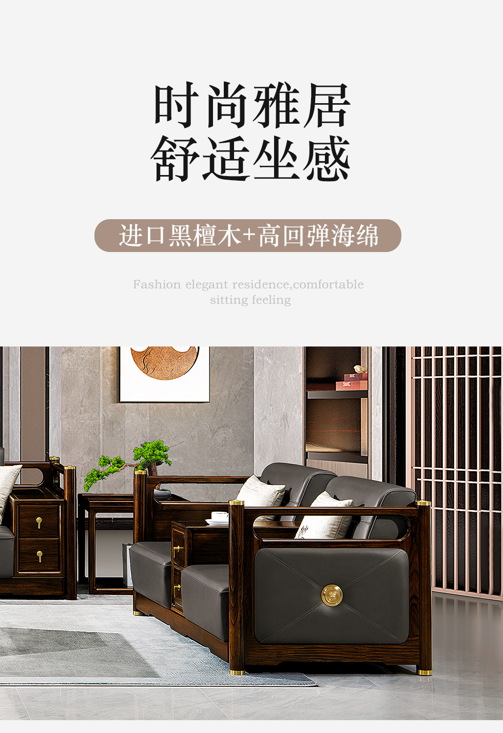 美檀家居 新中式 进口黑檀木+仿真皮+高回弹海绵+多层实木板+电镀五金 黑檀色 1+2+3 沙发¥8728