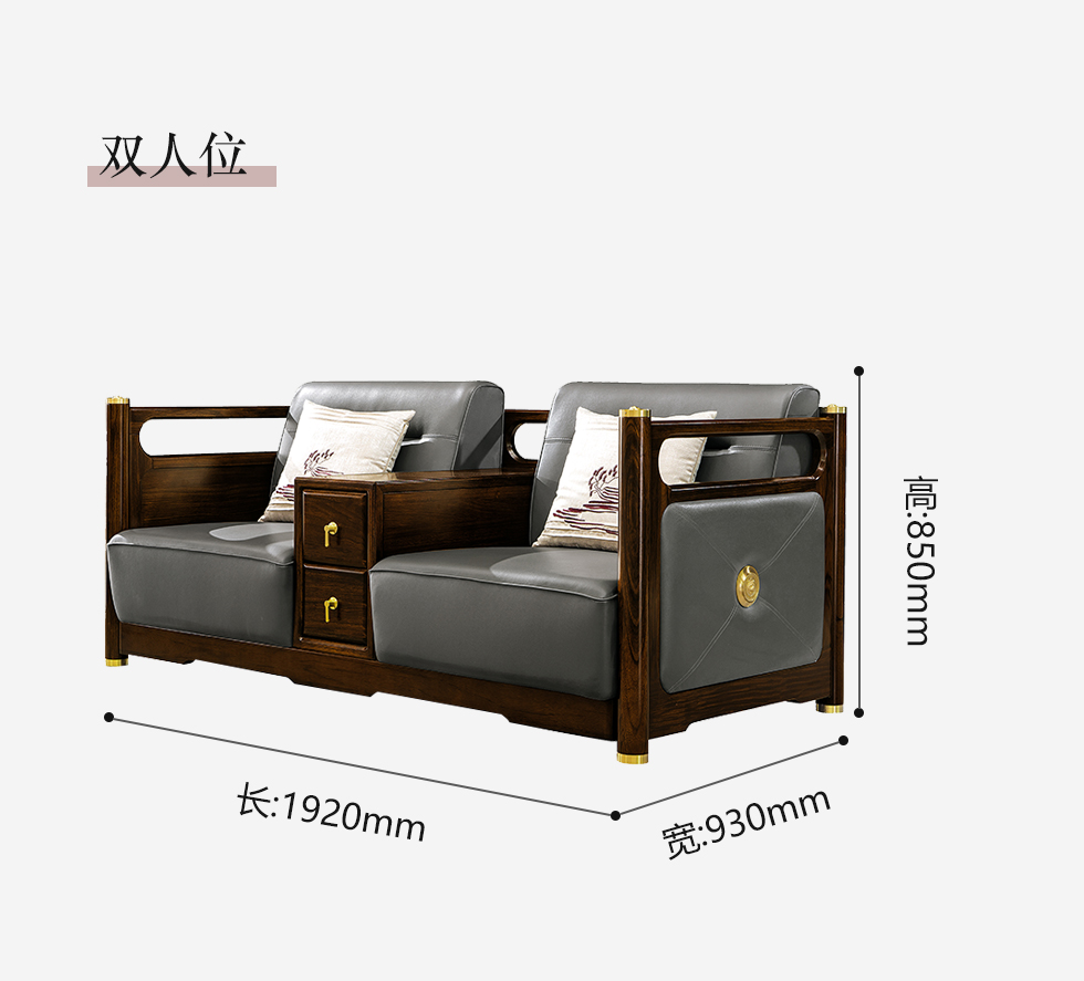 美檀家居 新中式 进口黑檀木+仿真皮+高回弹海绵+多层实木板+电镀五金 黑檀色 双人位 1.92米沙发
