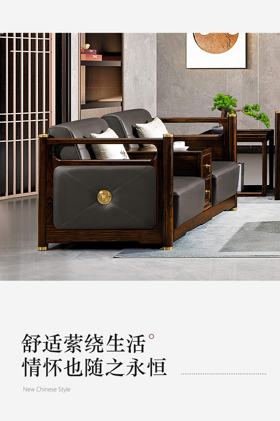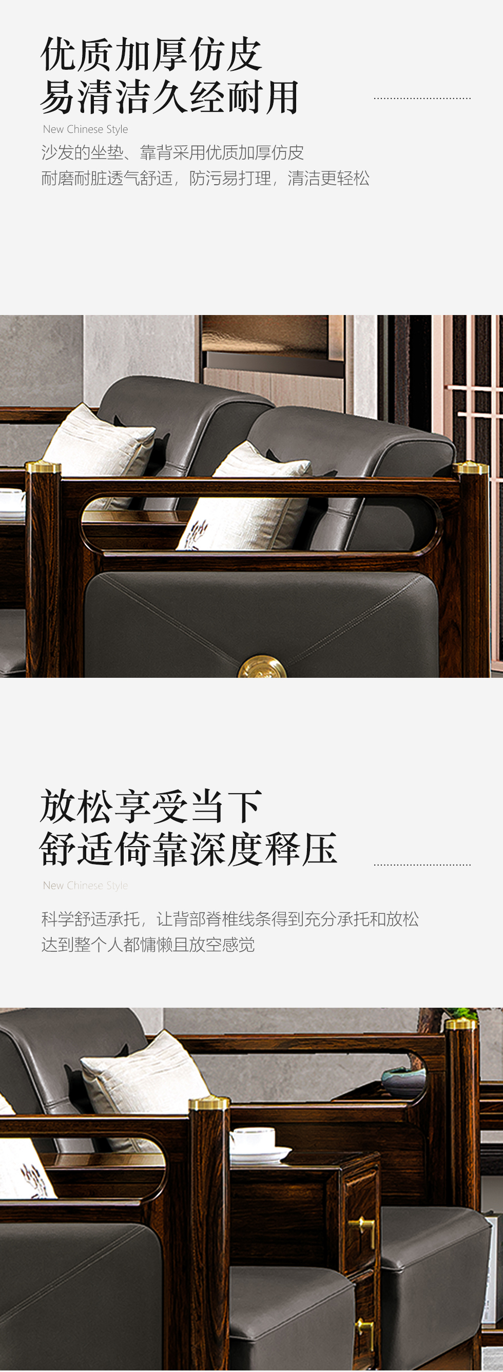 美檀家居 新中式 进口黑檀木+仿真皮+高回弹海绵+多层实木板+电镀五金 黑檀色 三人位 2.7米沙发