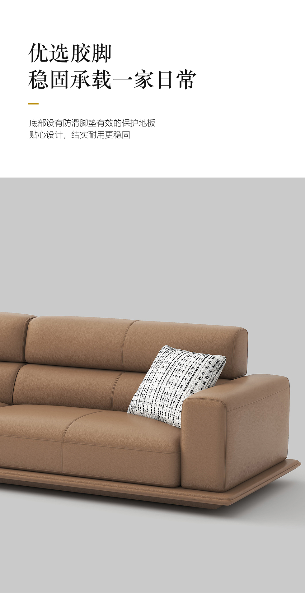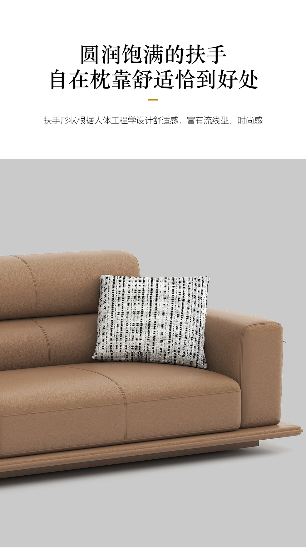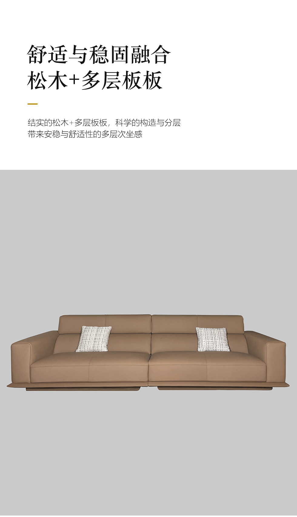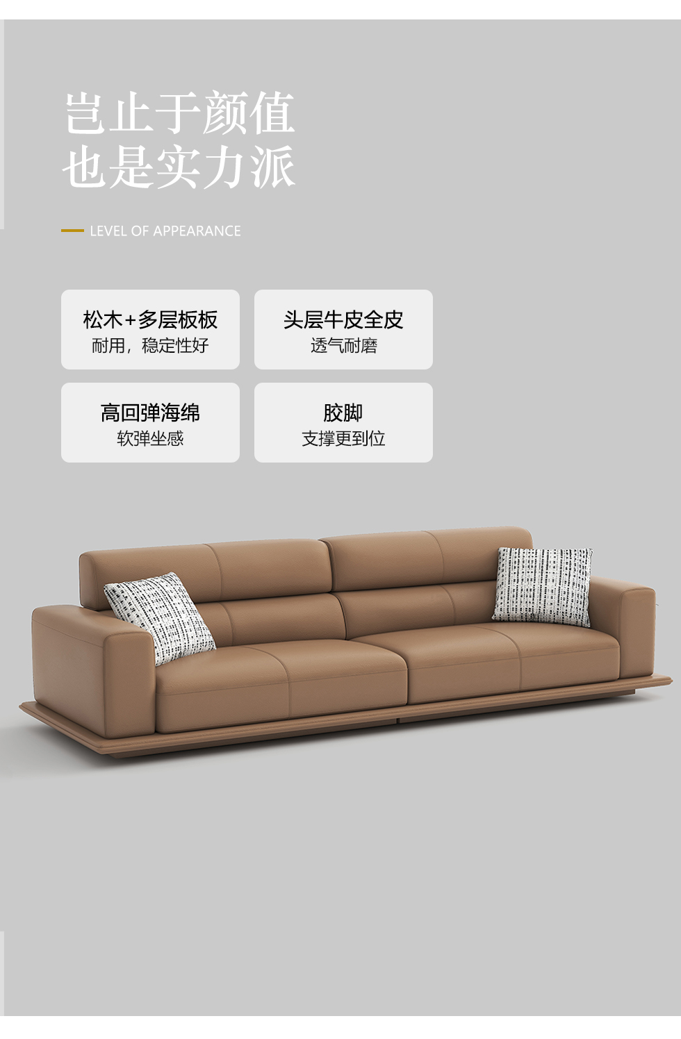 德卡图 现代简约 松木+多层板板+头层牛皮全真皮+高回弹海绵+靠包羽绒填充+胶脚 四人位 3.18米沙发