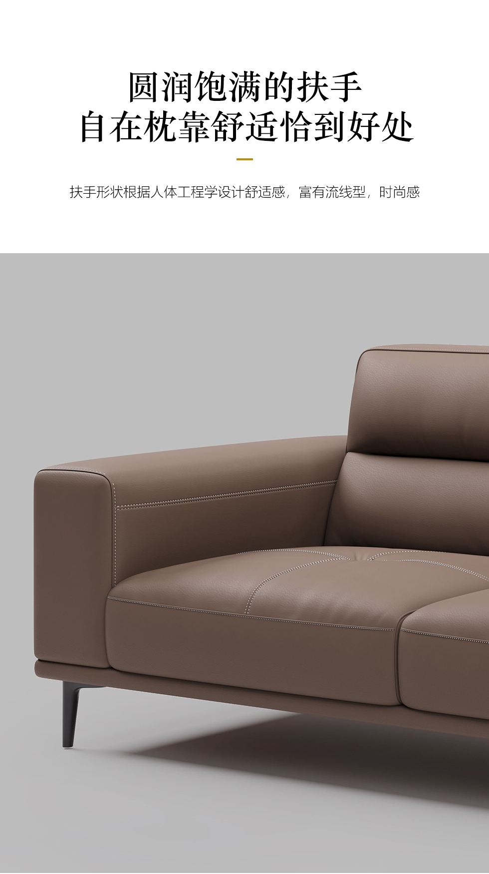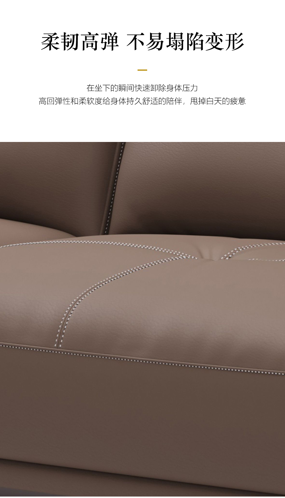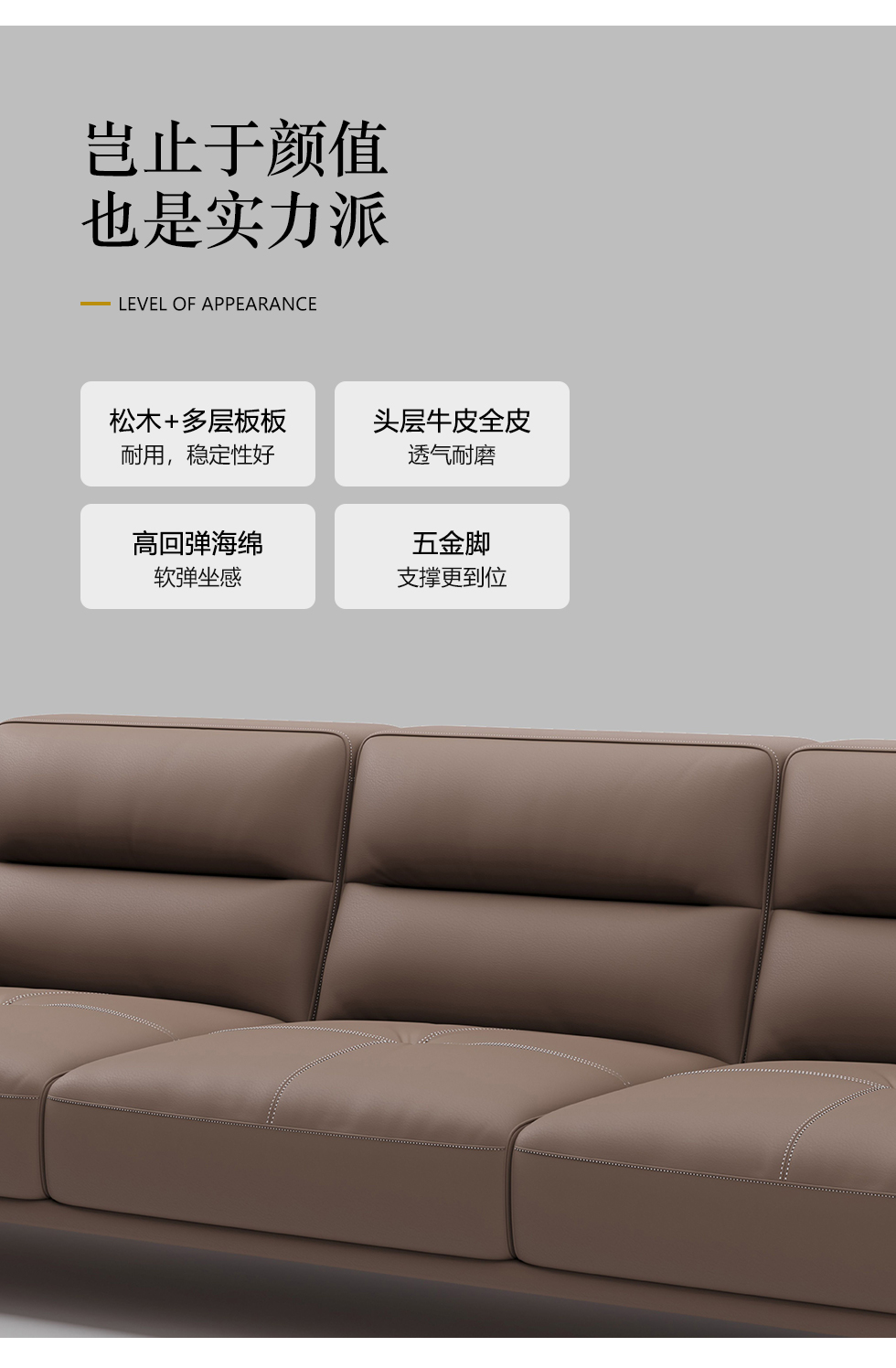 德卡图 现代简约 松木+多层板板+头层牛皮全真皮+高回弹海绵+靠包羽绒填充+胶脚 四人位 3.18米沙发