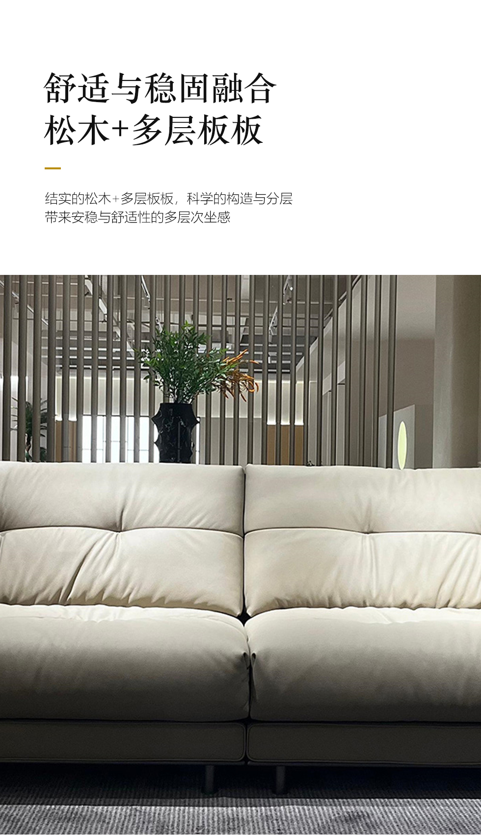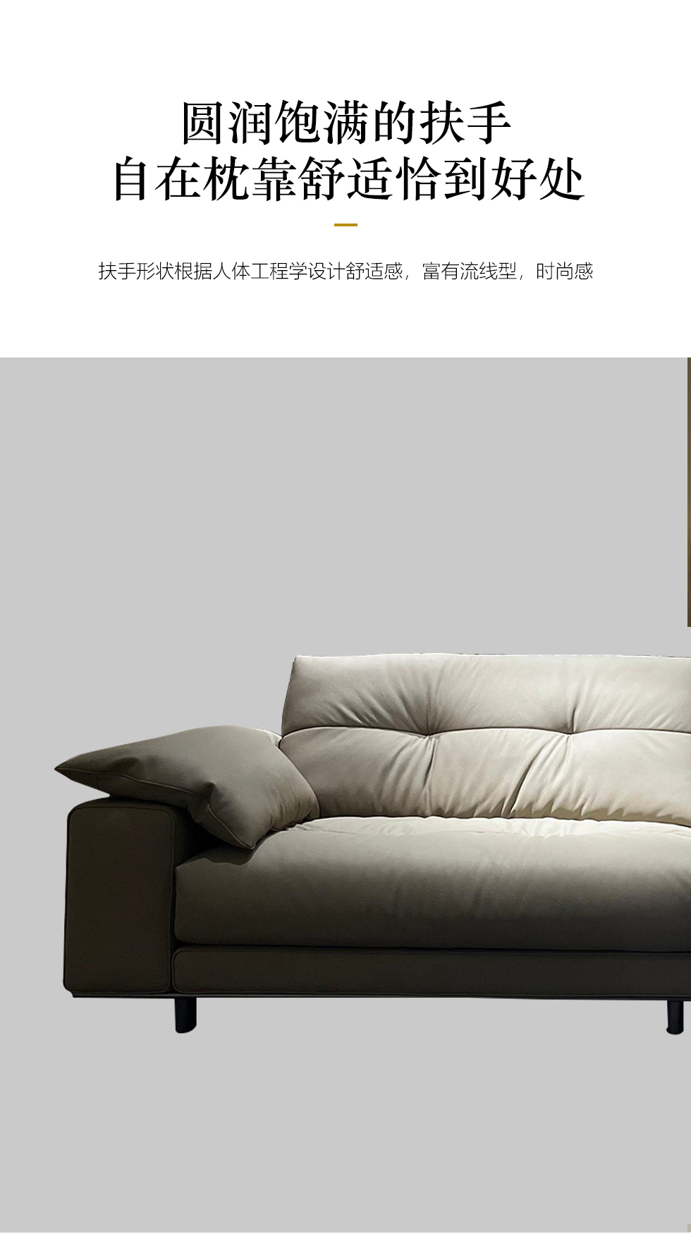 德卡图 现代简约 松木+多层板板+头层牛皮全真皮+高回弹海绵+靠包羽绒填充+胶脚 四人位 3.18米沙发