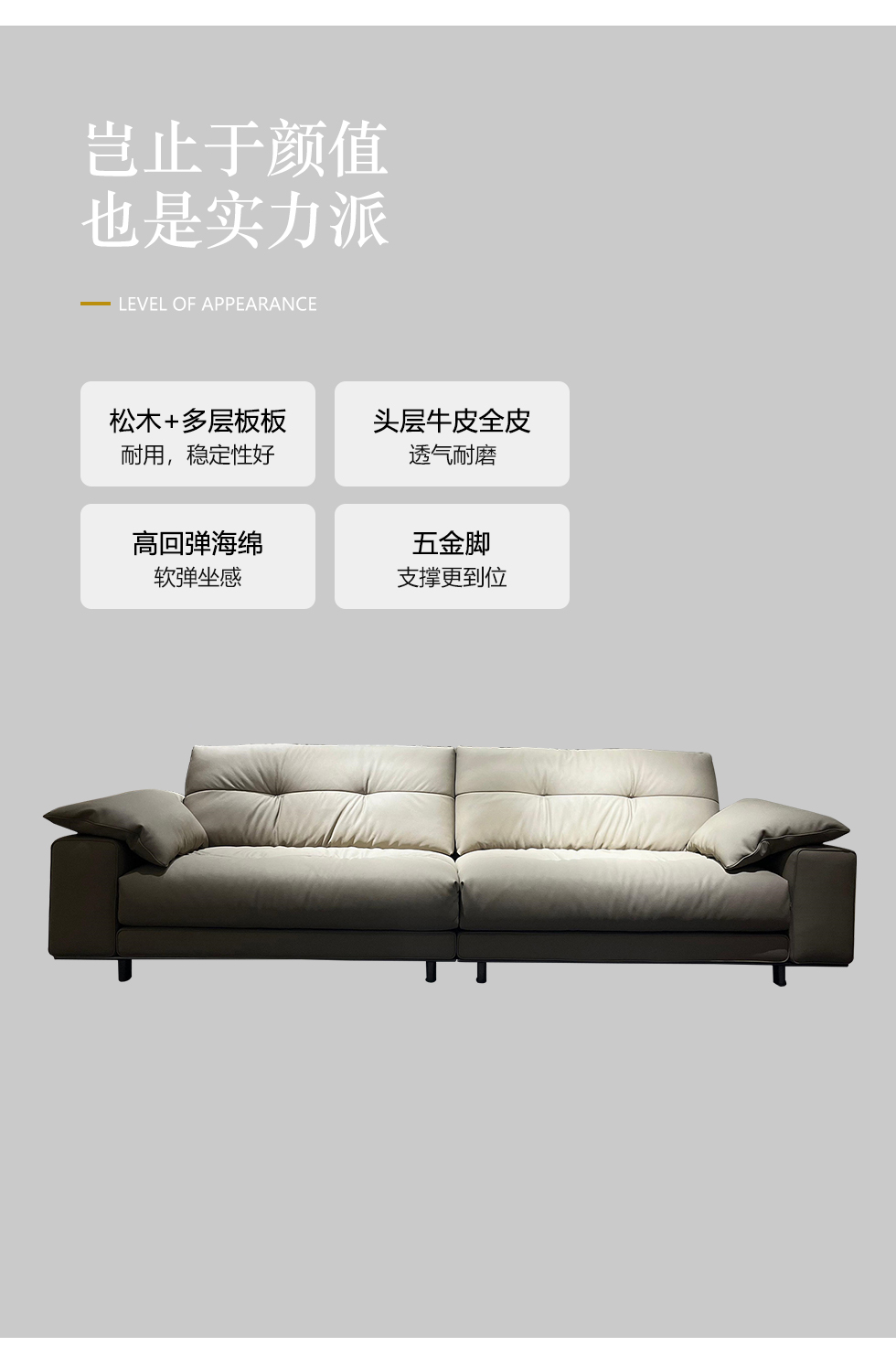 德卡图 现代简约 松木+多层板板+头层牛皮全皮+高回弹海绵+靠包羽绒填充+五金脚 四人位 3米沙发