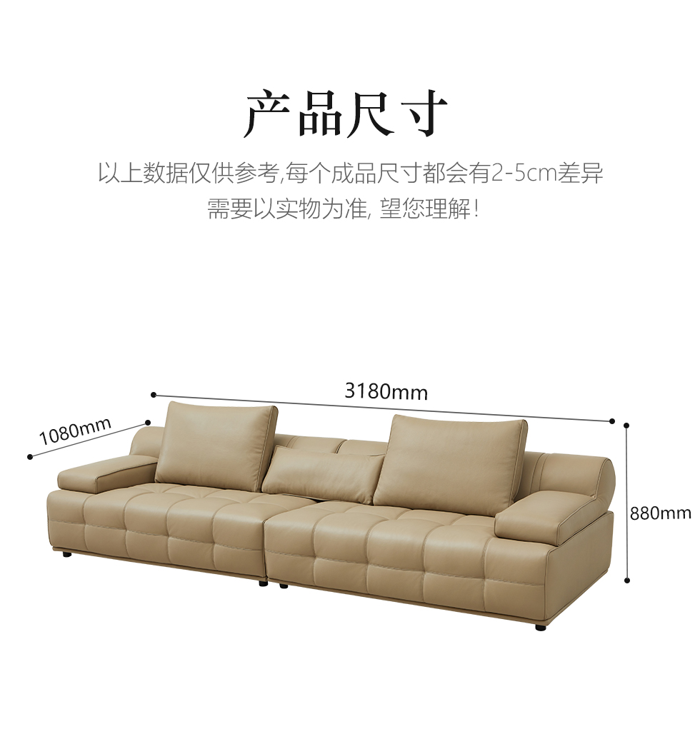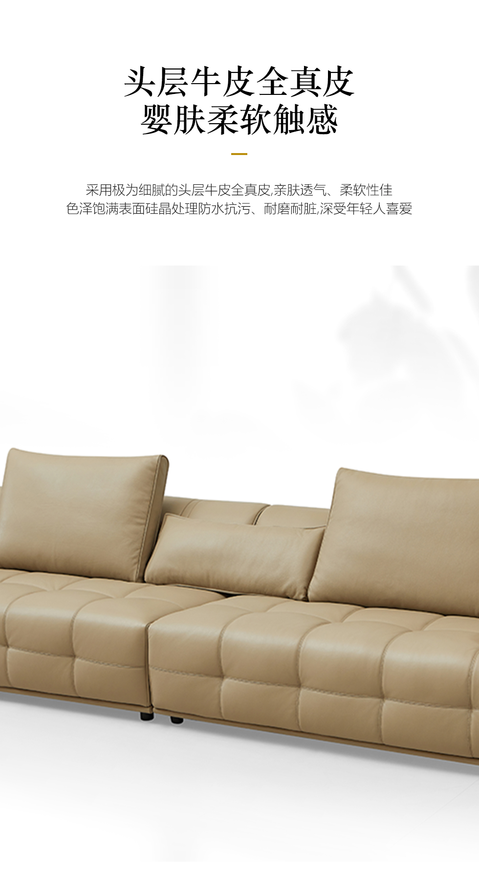 德卡图 现代简约 松木+多层板板+头层牛皮全真皮+高回弹海绵+靠包羽绒填充+胶脚 四人位 3.18米沙发