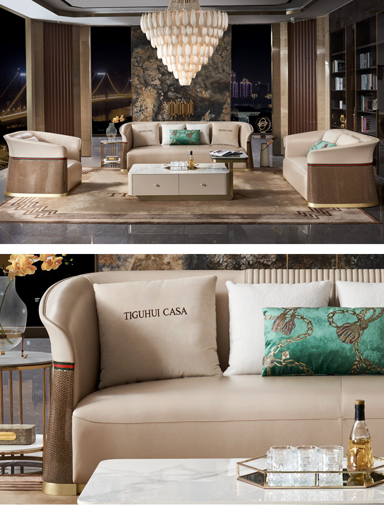 拉斐尔 轻奢 木纹木皮+多层实木板弯板+全实木内架+电镀五金+接触面头层牛皮真皮+绒布座包 1+3+左贵妃 3.8米沙发