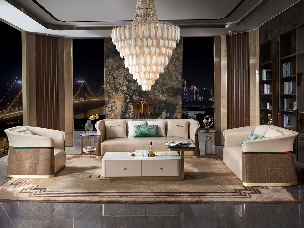 拉斐尔 轻奢 木纹木皮+多层实木板弯板+全实木内架+电镀五金+接触面头层牛皮真皮+仿真皮 1+2+3 沙发