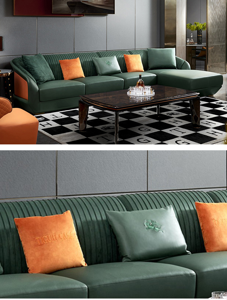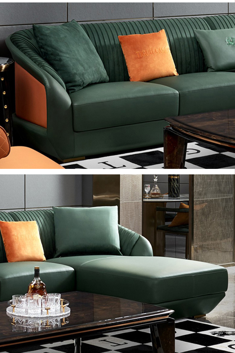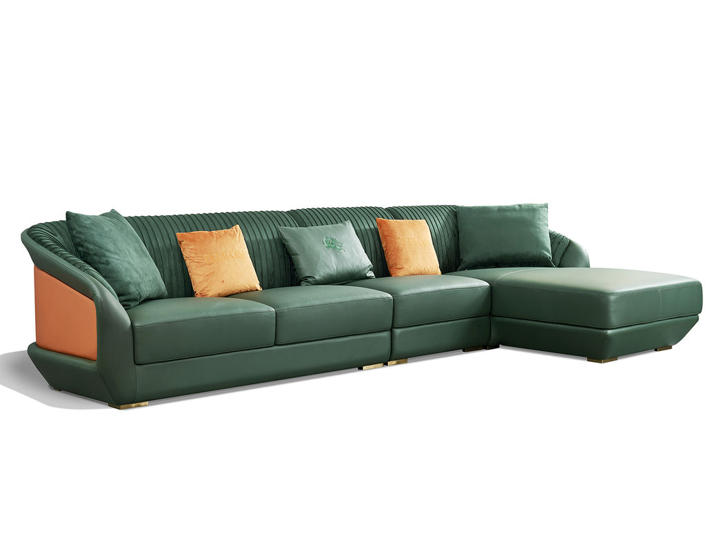 拉斐尔 轻奢 多层实木板弯板+全实木内架+电镀五金+接触面头层牛皮真皮+绒布+仿真皮 1+3+左贵妃 3.6米沙发