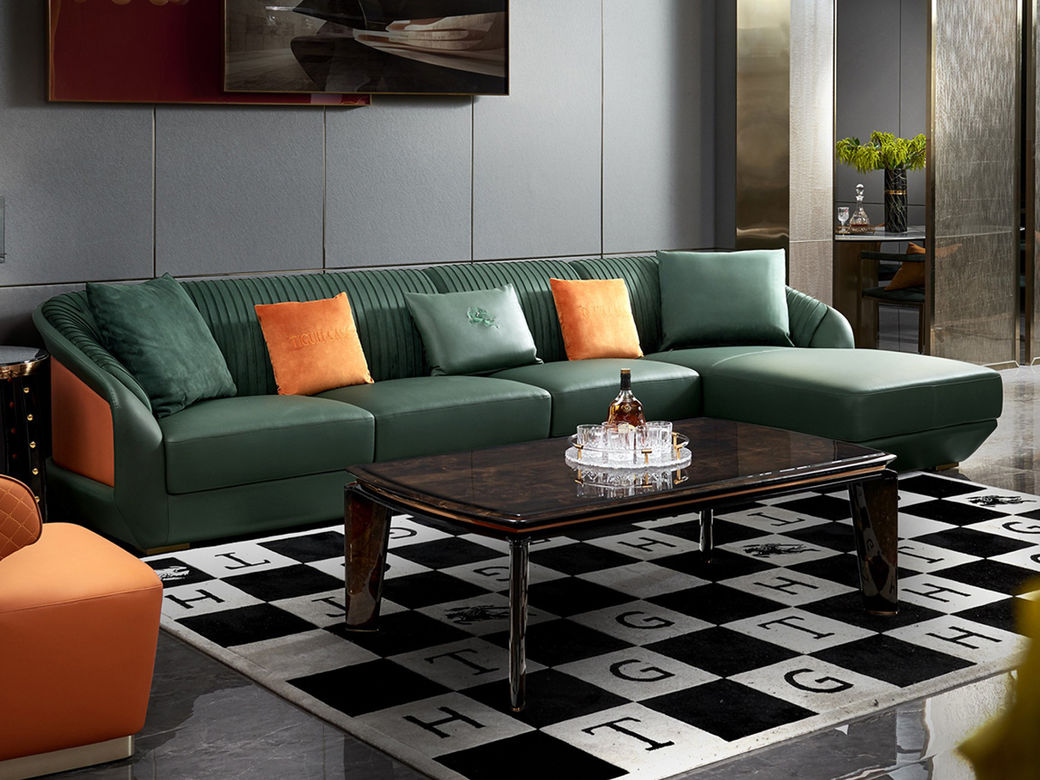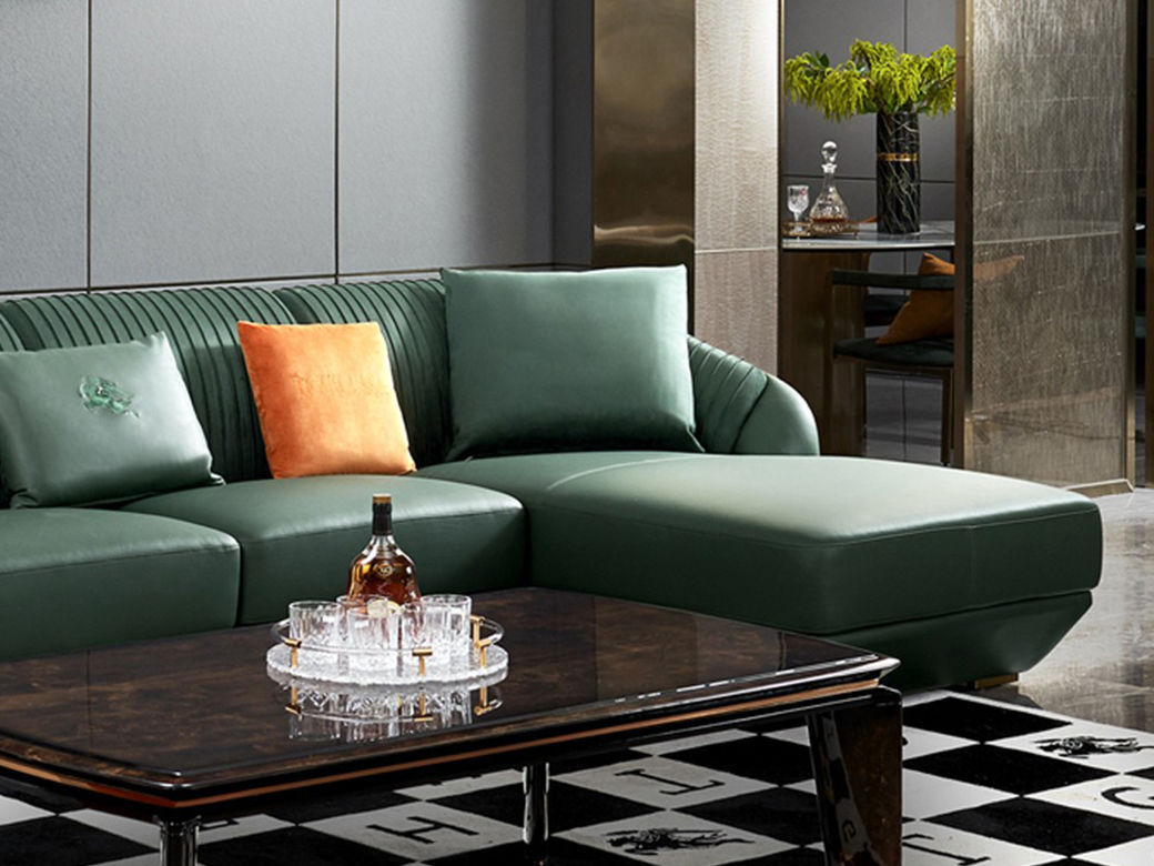 拉斐尔 轻奢 木纹木皮+多层实木板弯板+全实木内架+电镀五金+接触面头层牛皮真皮+绒布座包 1+3+左贵妃 3.8米沙发