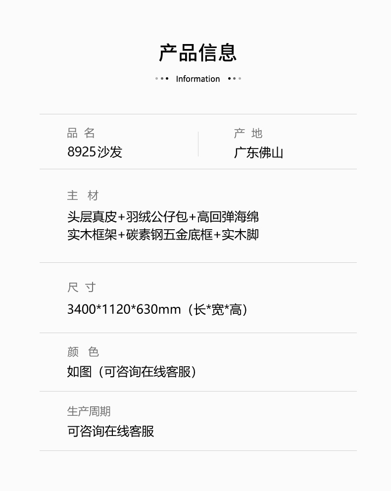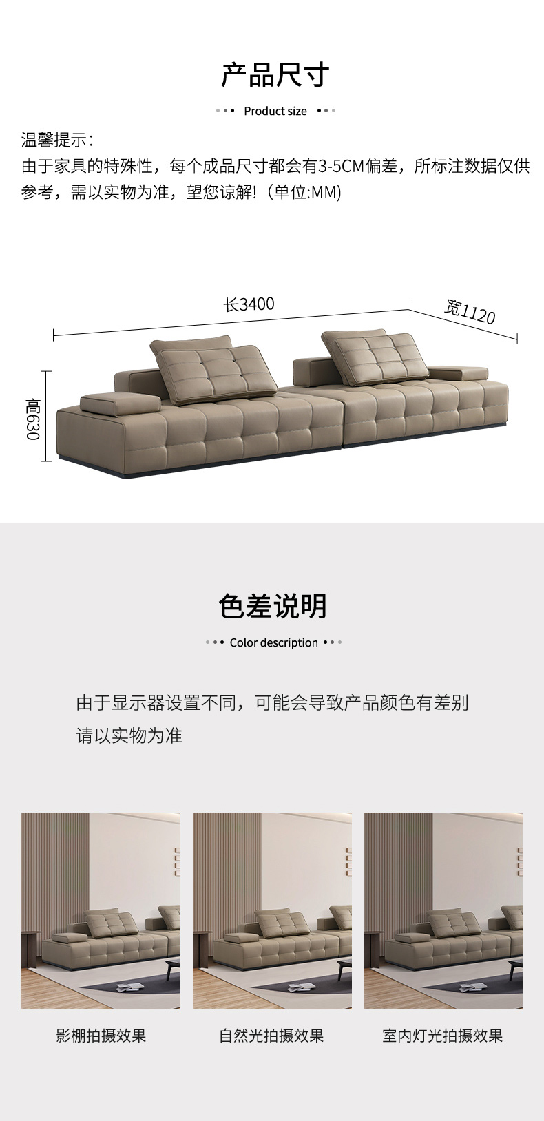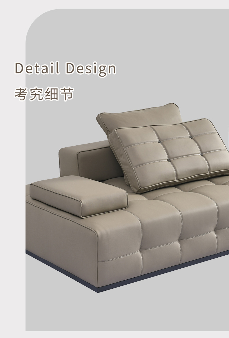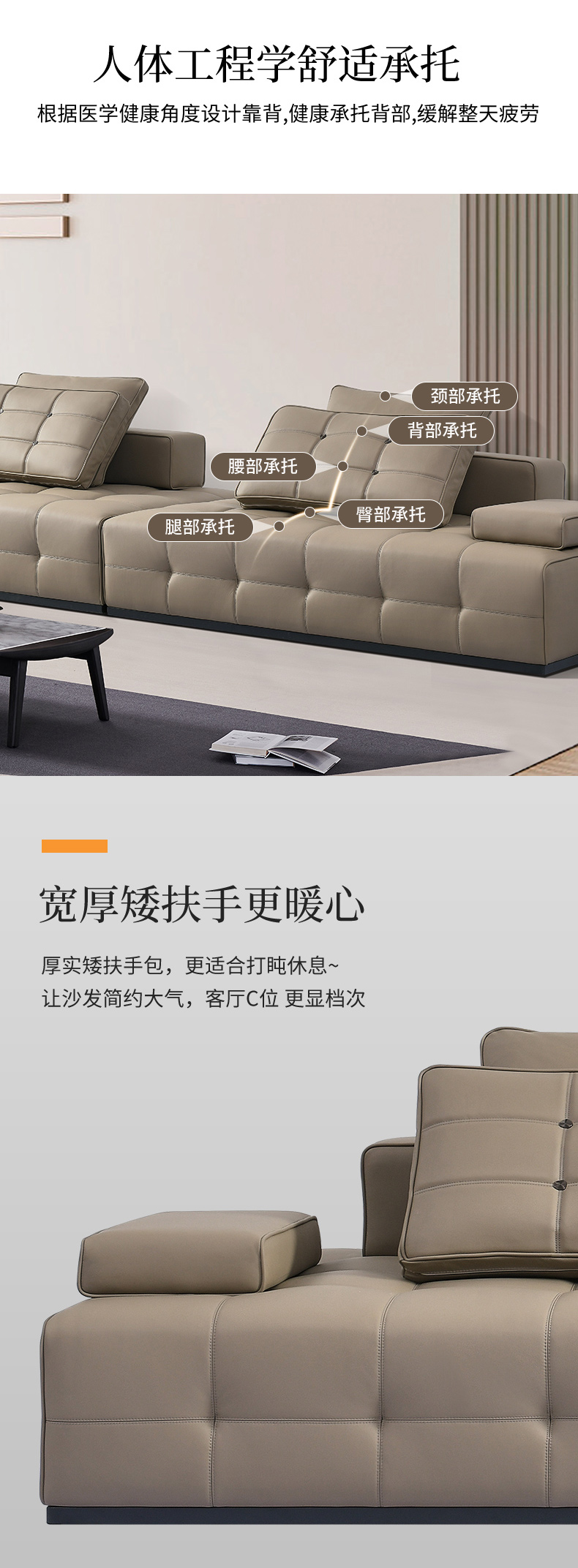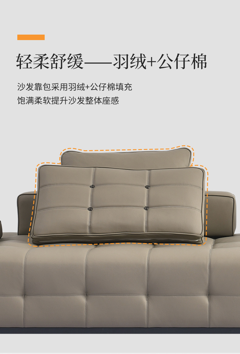小红书系列 极简 接触面头层牛皮+实木多层板+进口俄罗斯落叶松框架+高回弹高密度海绵+羽绒+羽丝绒结合+靠包羽绒+羽丝绒结合 3.7米迪兰沙发