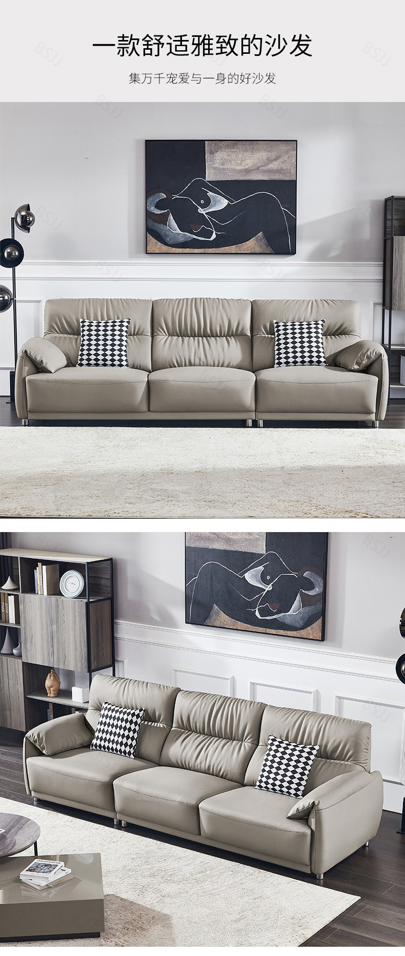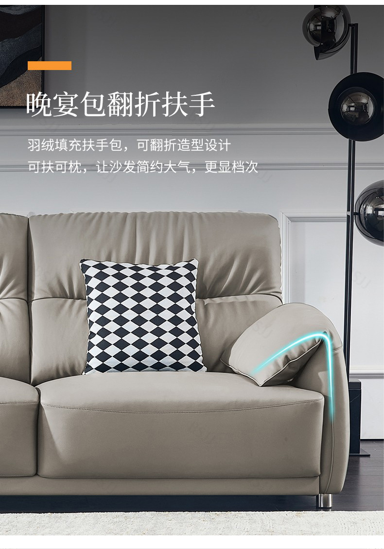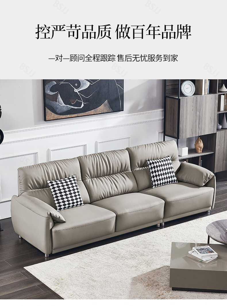 非凡工艺 现代简约 接触面头层黄牛皮+仿皮 E1级夹板+松木框架 无粉海绵 座包35D高回弹海绵 靠背公仔棉+羽绒填充 样色 直排2.8米大三人位 皮艺沙发
