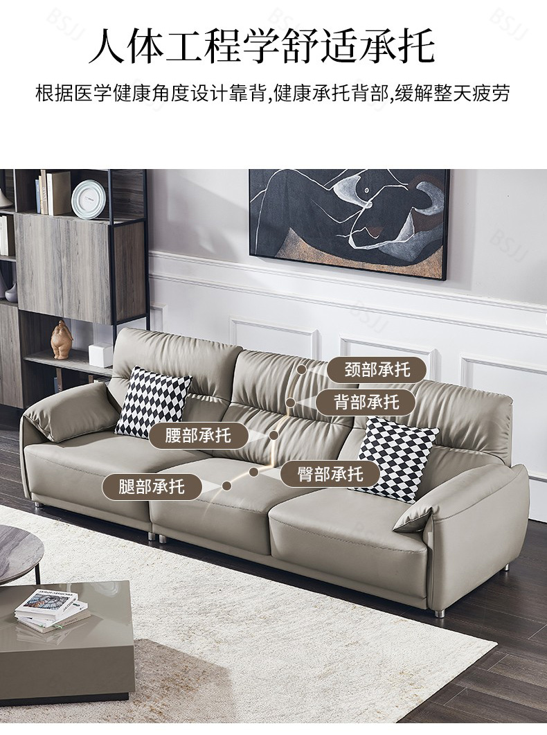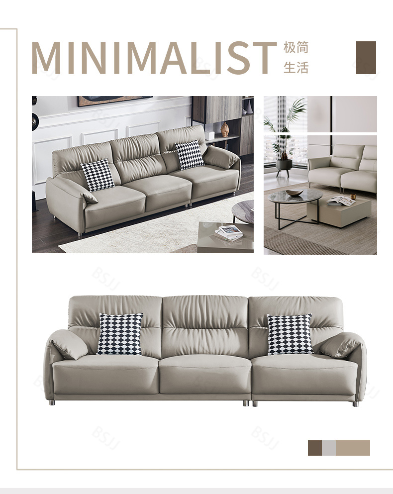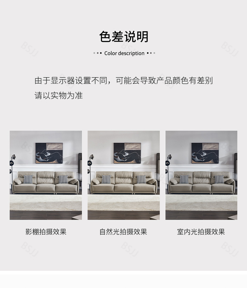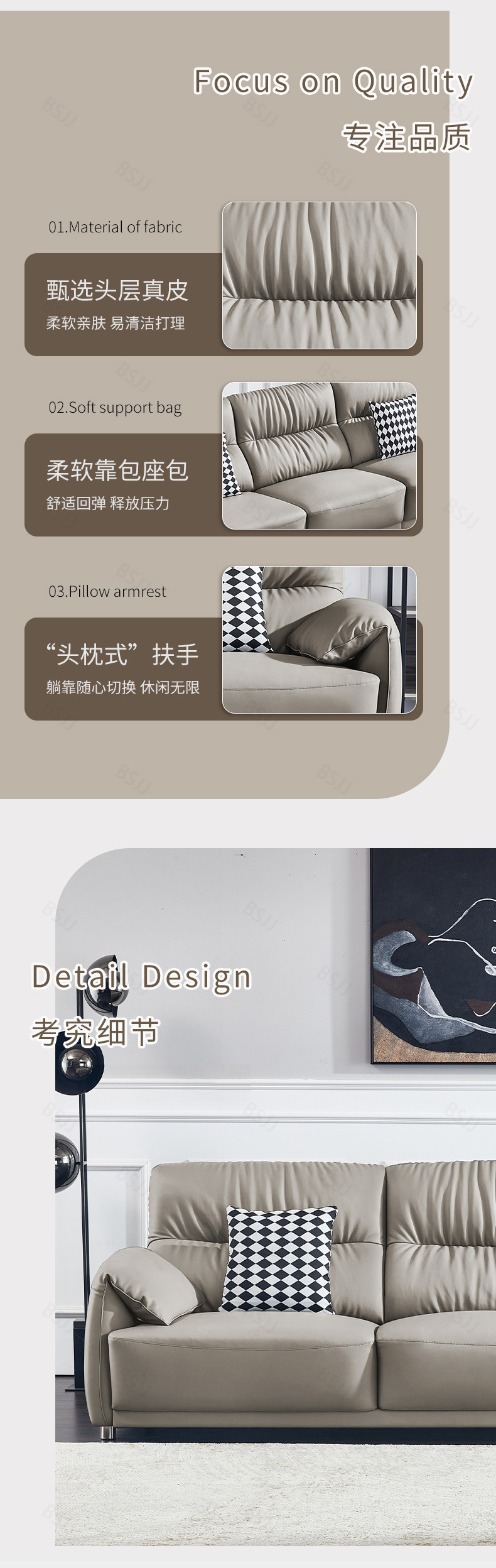 非凡工艺 现代简约 接触面头层黄牛皮+仿皮 E1级夹板+松木框架 无粉海绵 座包35D高回弹海绵 靠背公仔棉+羽绒填充 样色 直排2.8米大三人位 皮艺沙发