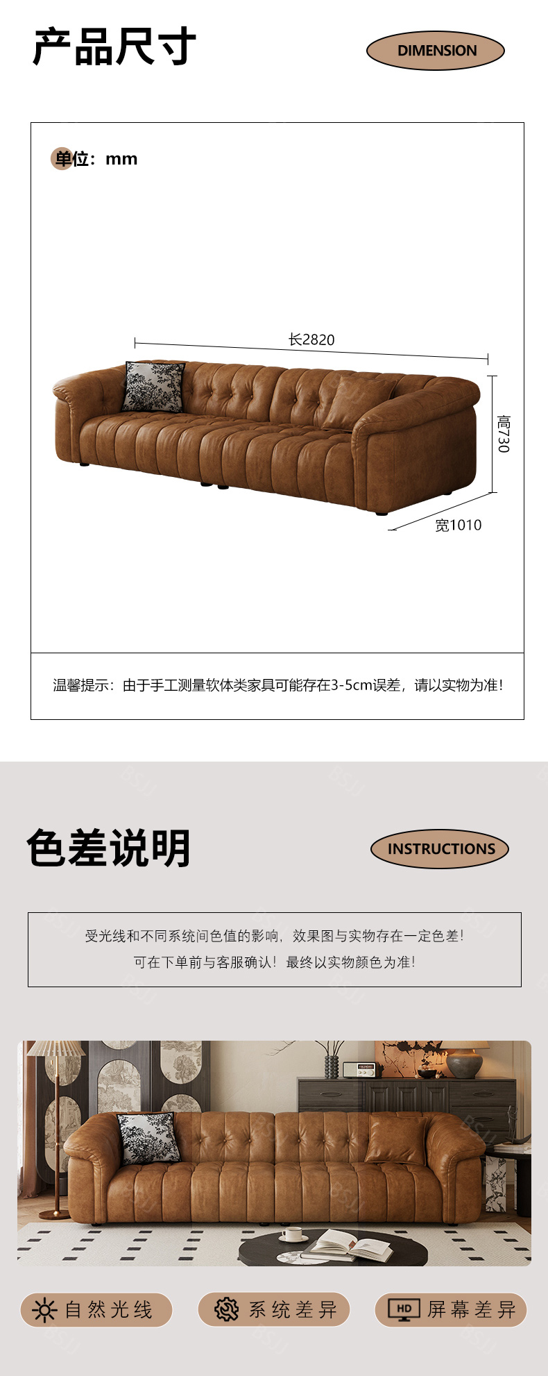 中古·尚 网红 中古风 全实木内架+多层实木板+生态真皮+仿真皮+高回弹海绵+电镀五金 四人位 2.7米沙发¥6452