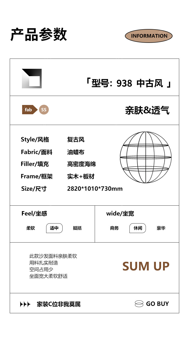 中古·尚 网红 中古风 油蜡布+松木+桉木+弹簧+橡筋+网布+高密度海绵 2.8米 大四人位 分体 沙发