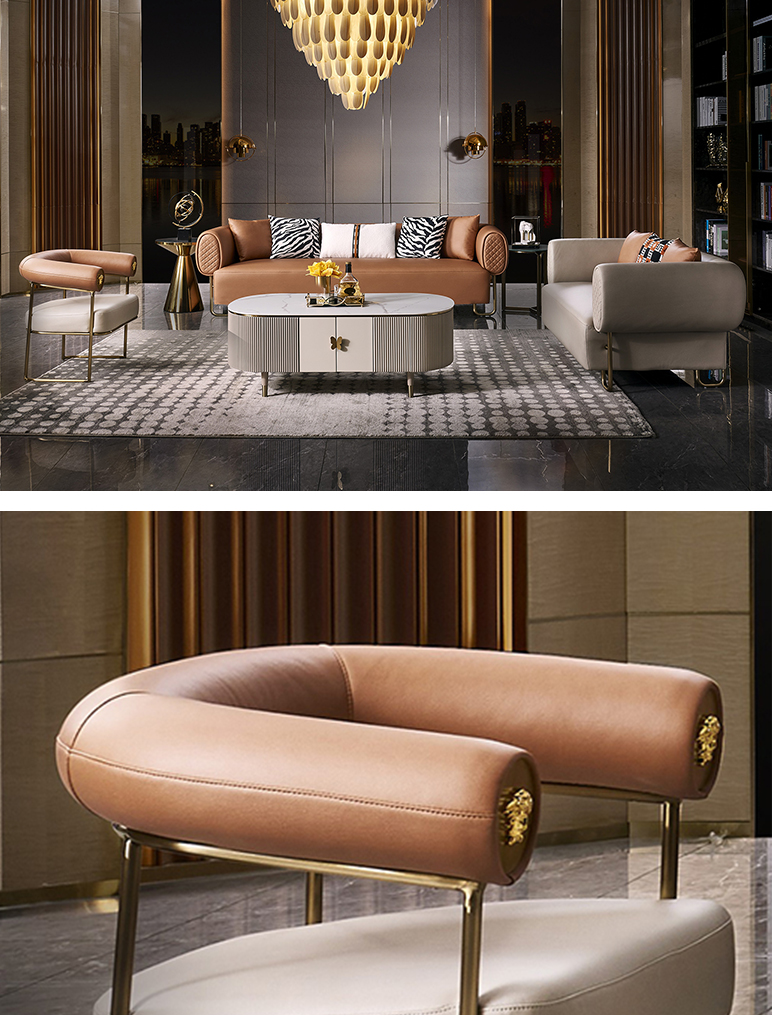 拉斐尔 轻奢 纳帕皮+仿真皮+(单位绒布)+进口落叶松+多层实木板+高回弹海绵+电镀不锈钢五金 1+1+2+4 沙发¥52816
