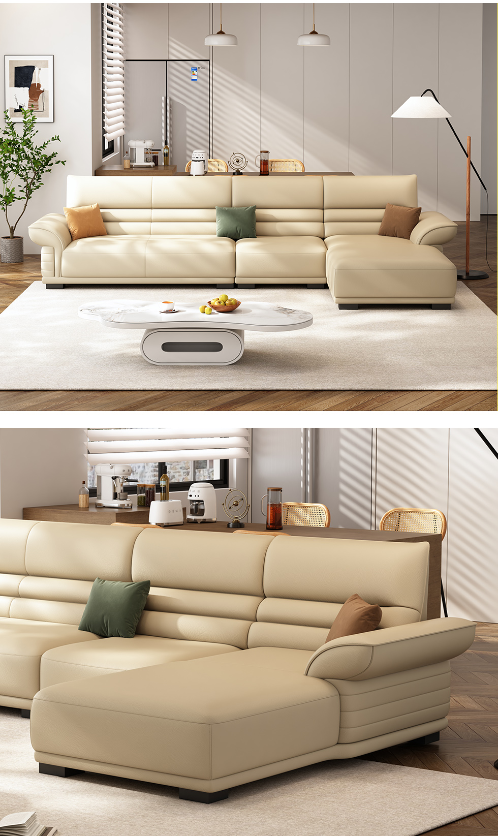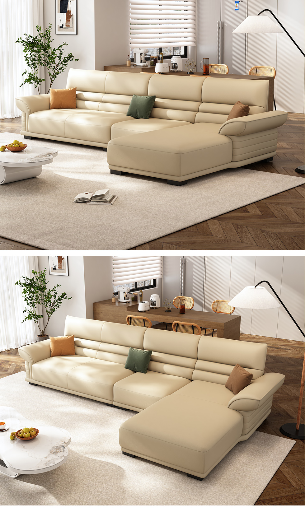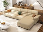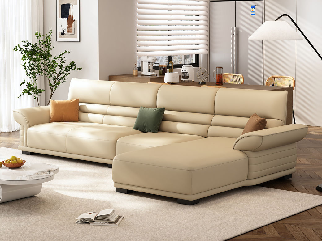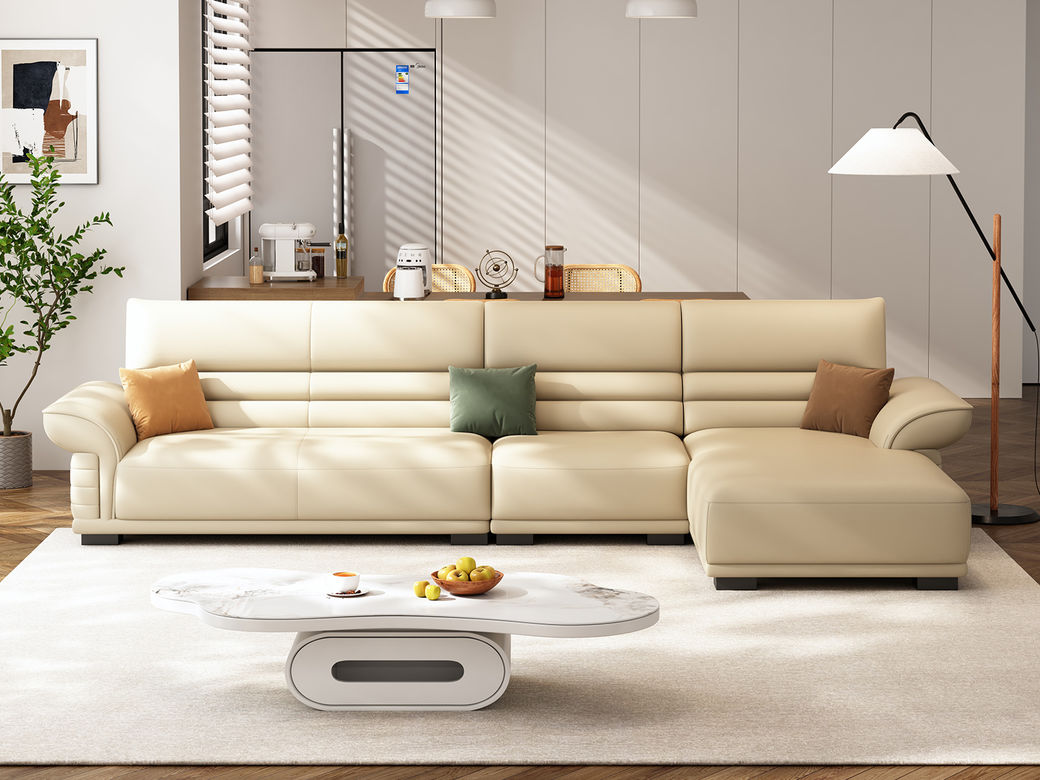 梵纳意简 极简 接触面头层牛皮+仿皮+多层实木板+实木内架+高回弹海绵+实木5分脚米黄色 1+左贵妃+3 3.45米沙发 |