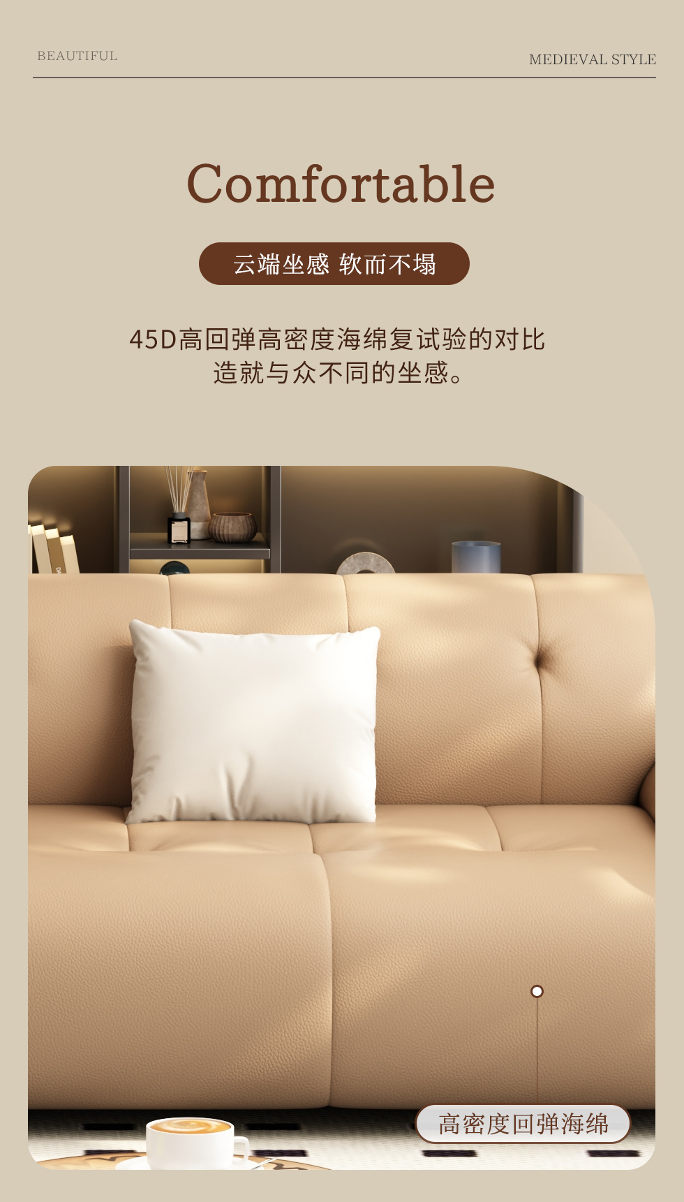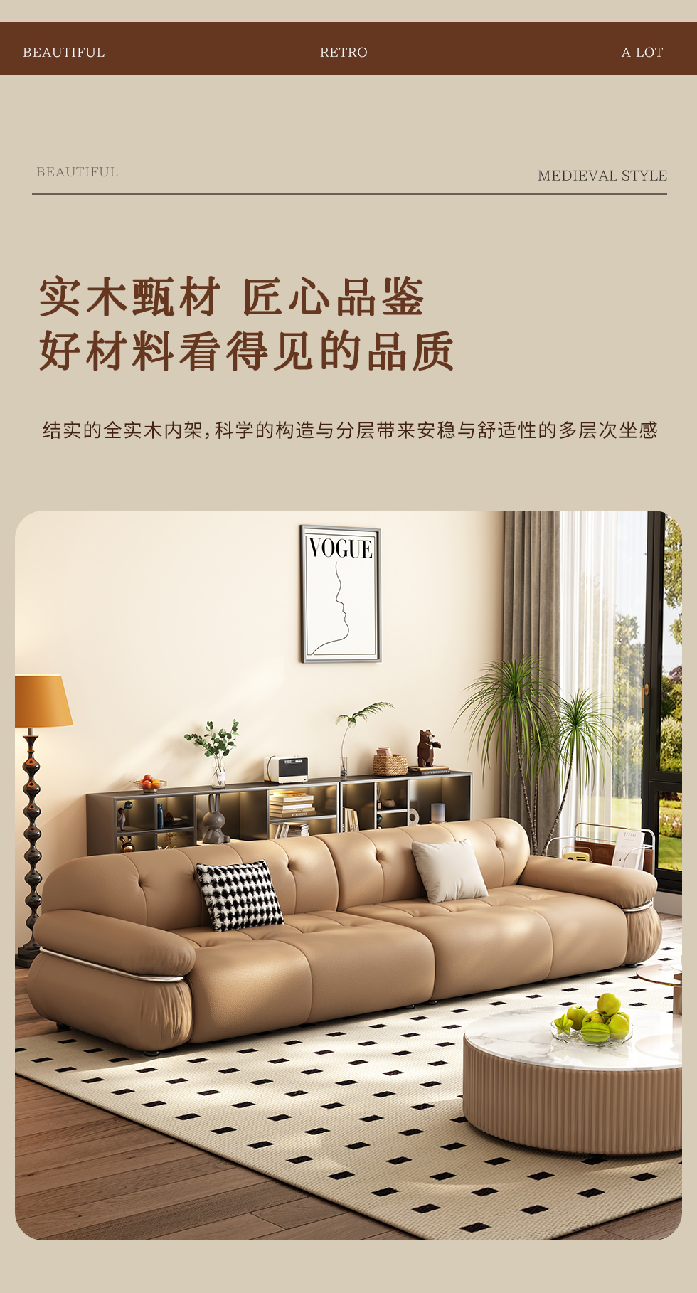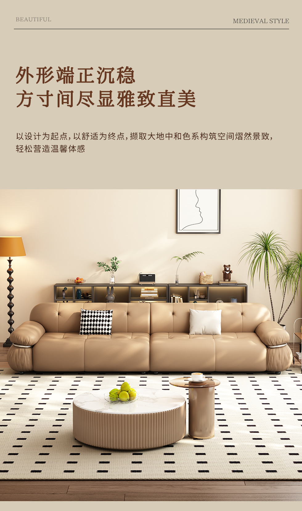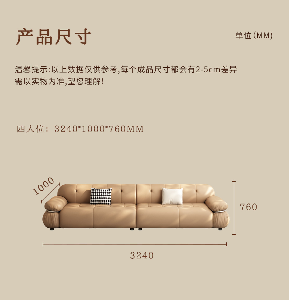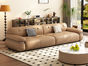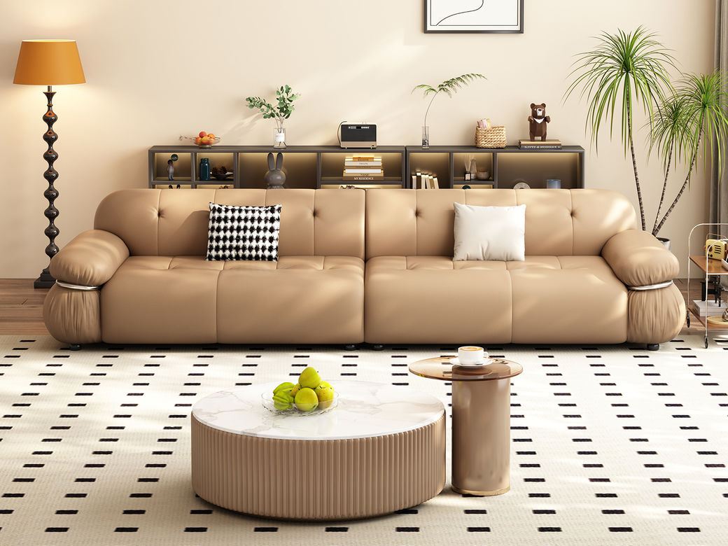 【中古·尚】中古.尚 极简 接触面头层牛皮+仿皮+多层实木板+实木内架+高回弹海绵+实木5分脚 卡其色 大四位 3.24米沙发
