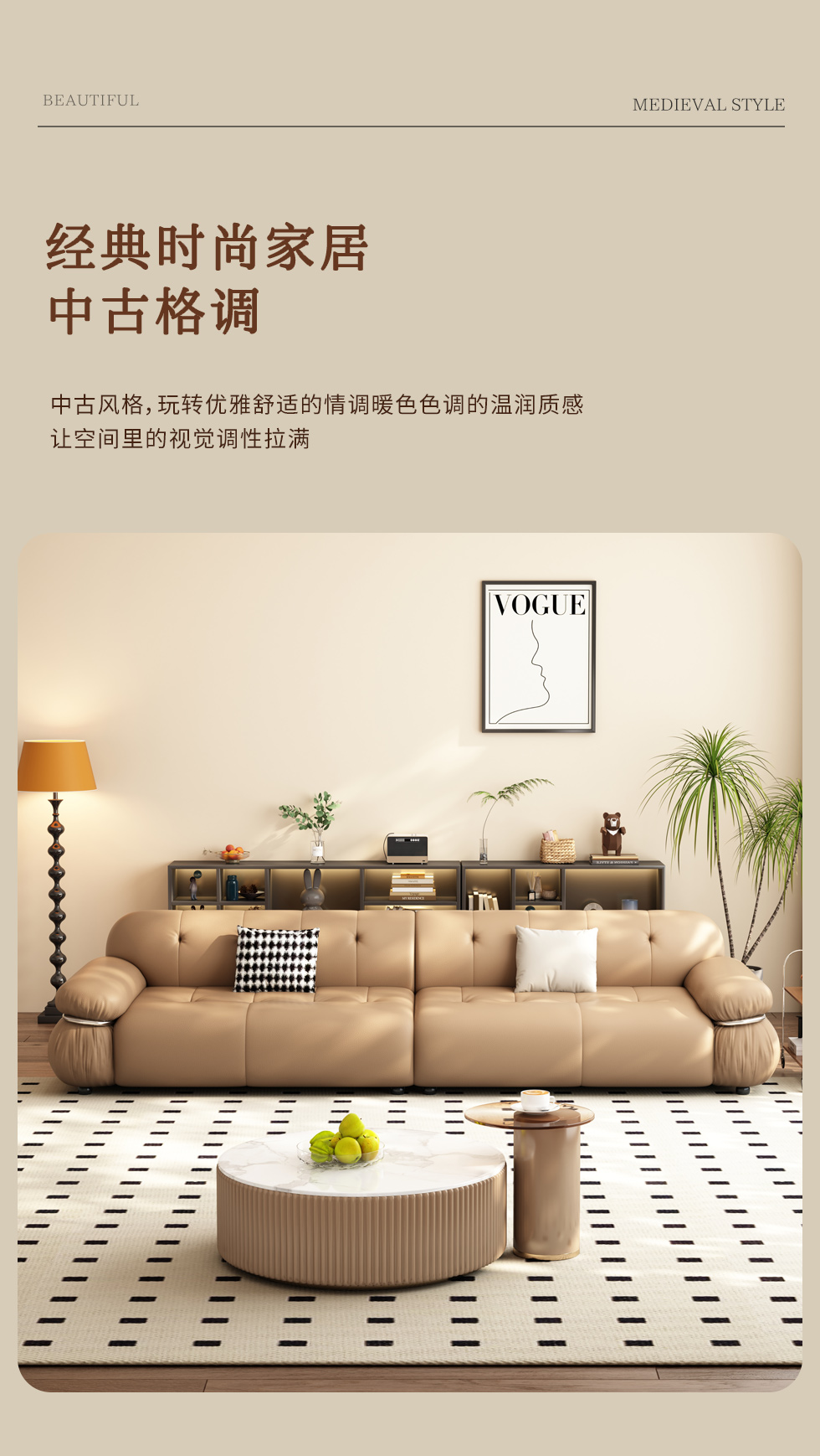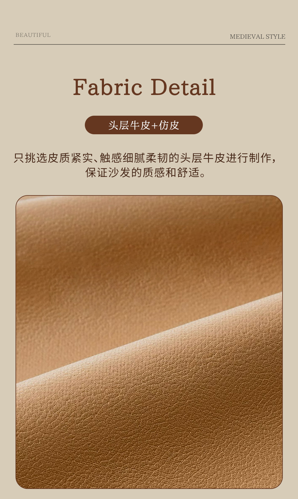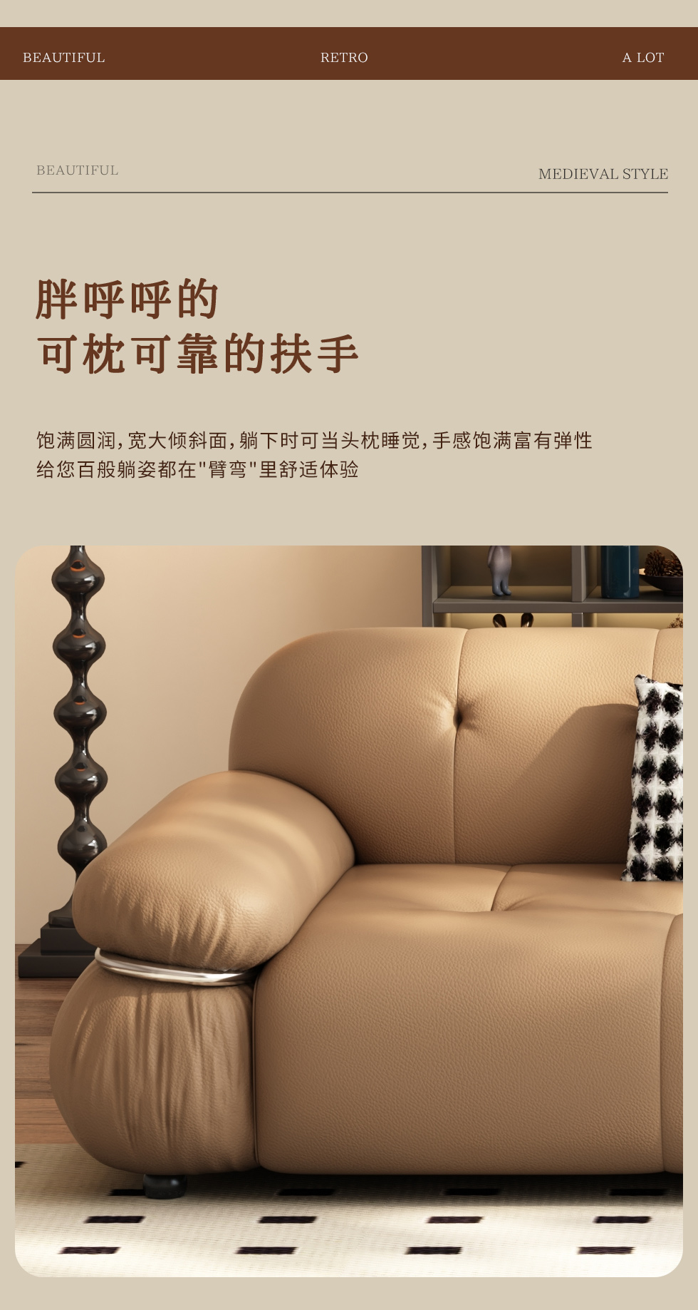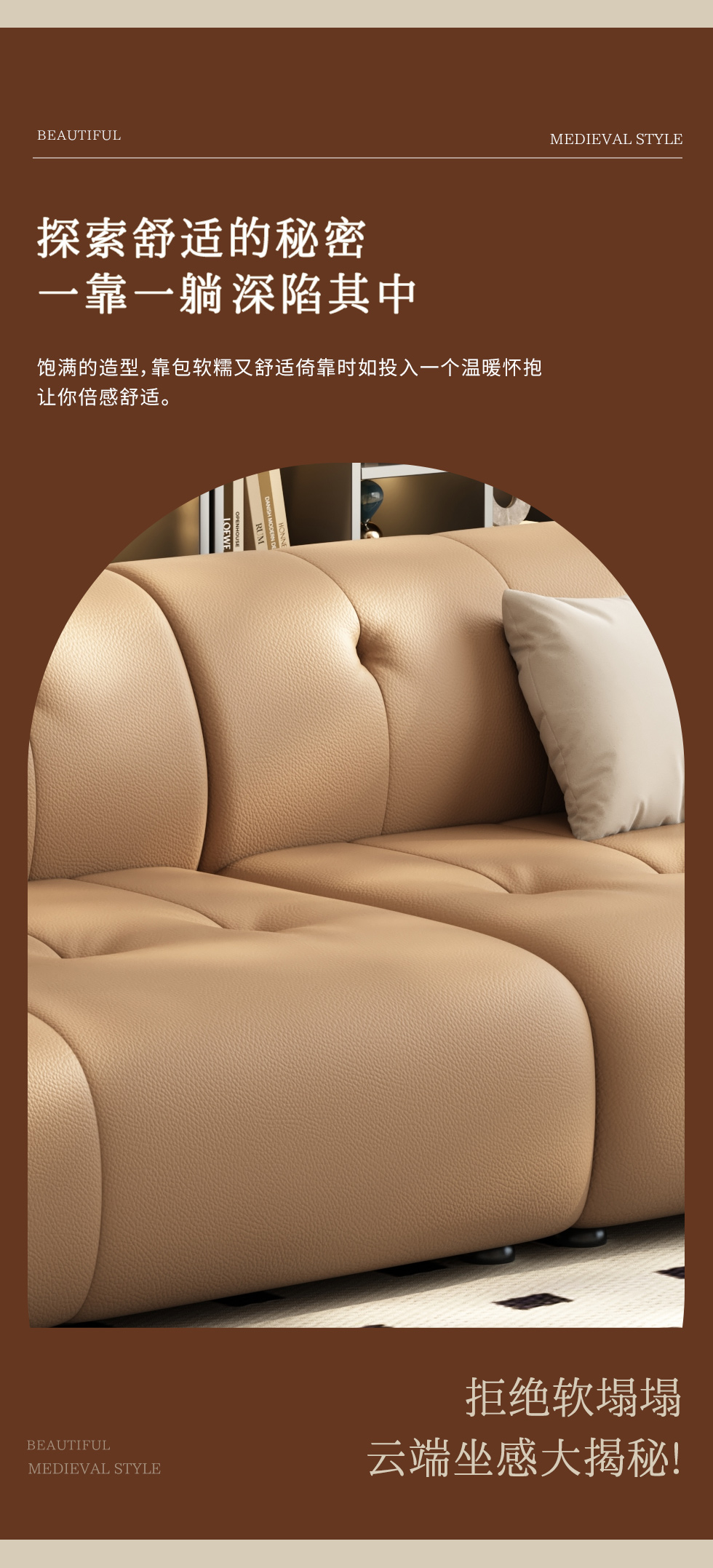 【中古·尚】中古.尚 极简 接触面头层牛皮+仿皮+多层实木板+实木内架+高回弹海绵+实木5分脚 卡其色 大四位 3.24米沙发