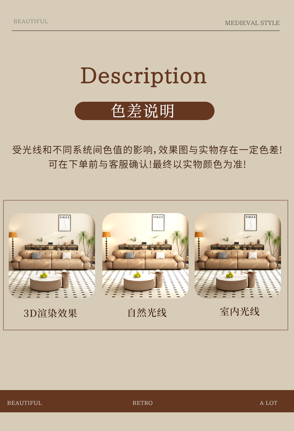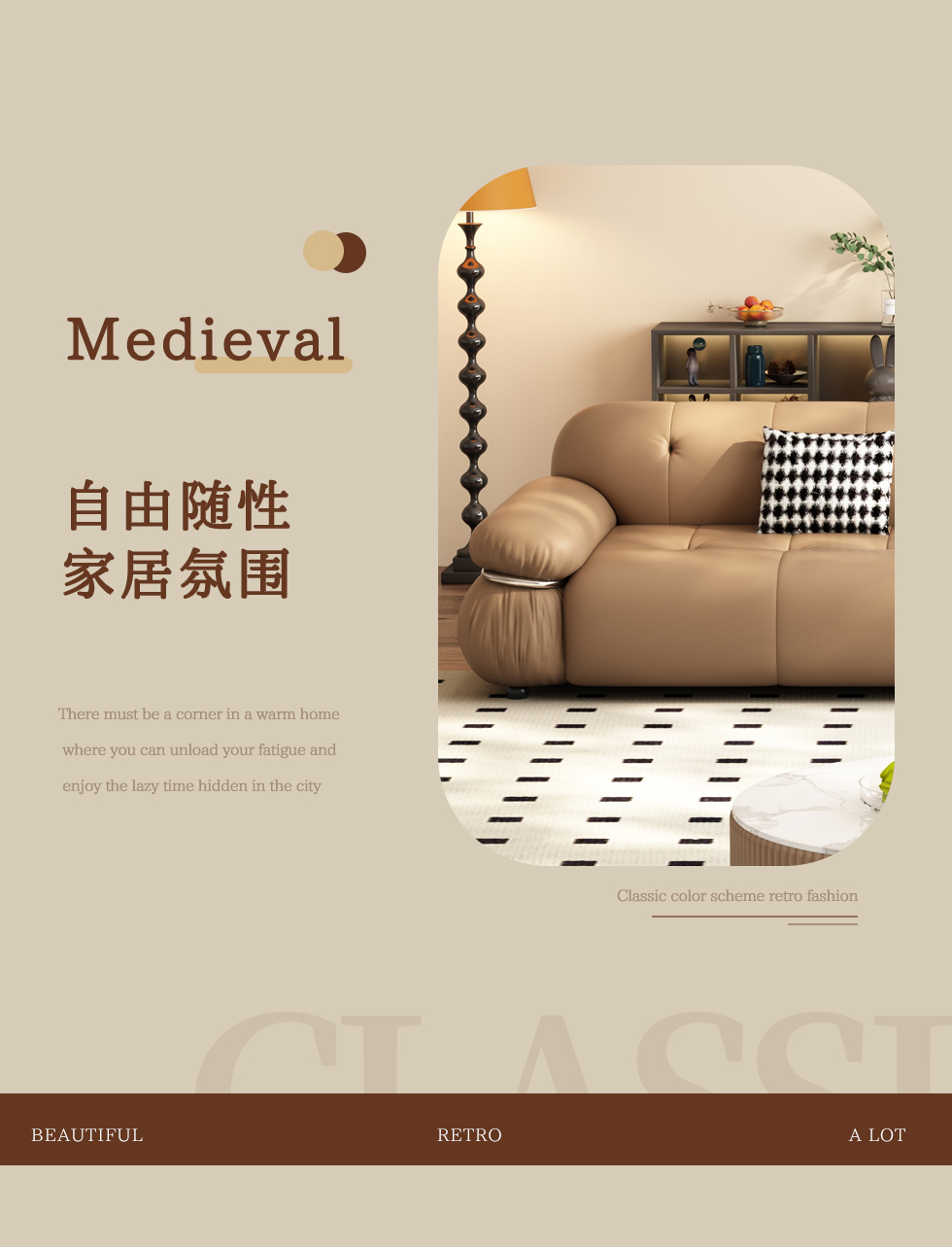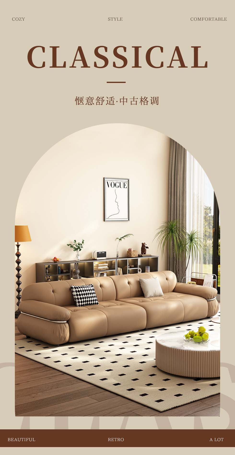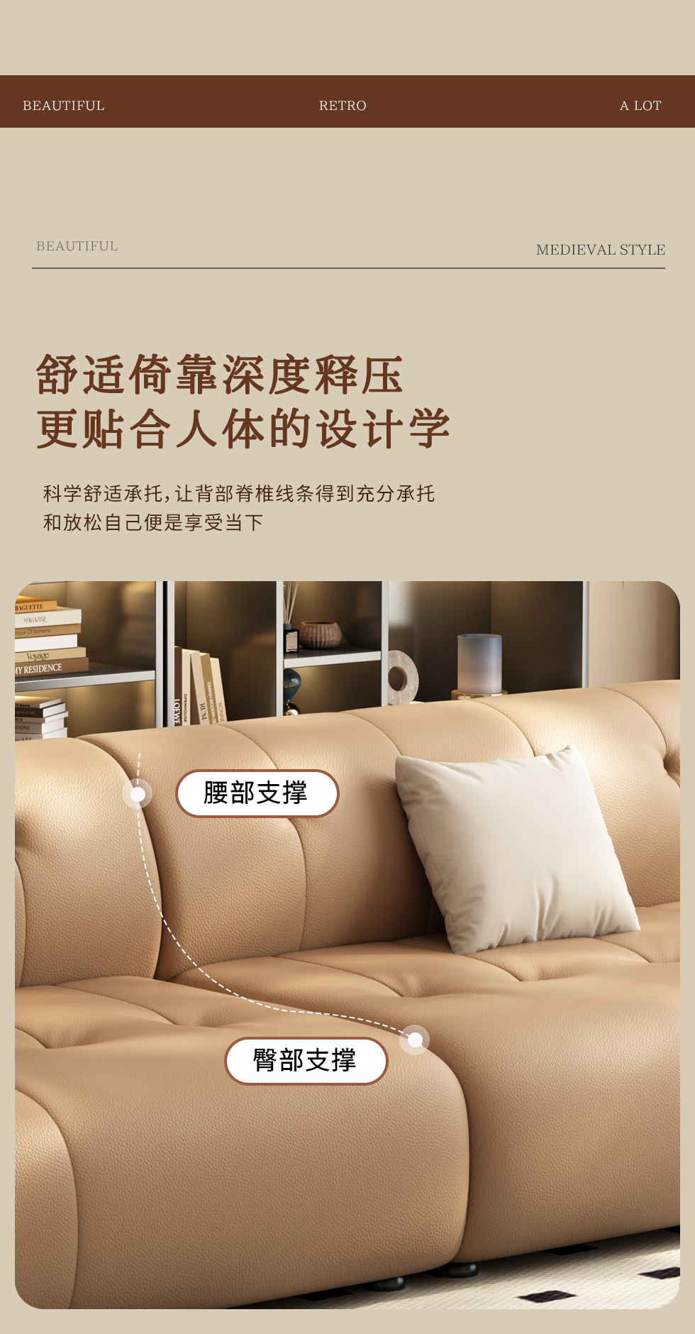 【中古·尚】中古.尚 极简 接触面头层牛皮+仿皮+多层实木板+实木内架+高回弹海绵+实木5分脚 卡其色 大四位 3.24米沙发