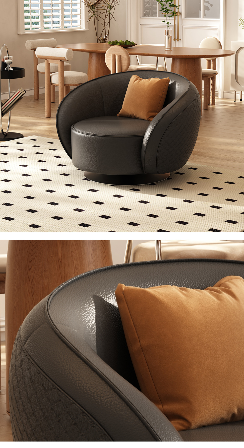 B系优选 极简 接触面头层牛皮+仿皮+多层实木板+实木内架+高回弹海绵+可转动五金底盘 亮黑色 单椅