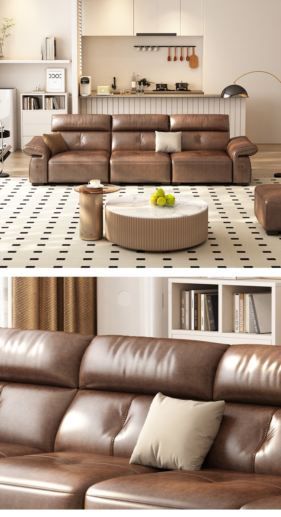 B系优选 极简 接触面头层牛皮+仿皮+多层实木板+实木内架+高回弹海绵+实木5分脚 咖色 直排四位 3米沙发¥8155