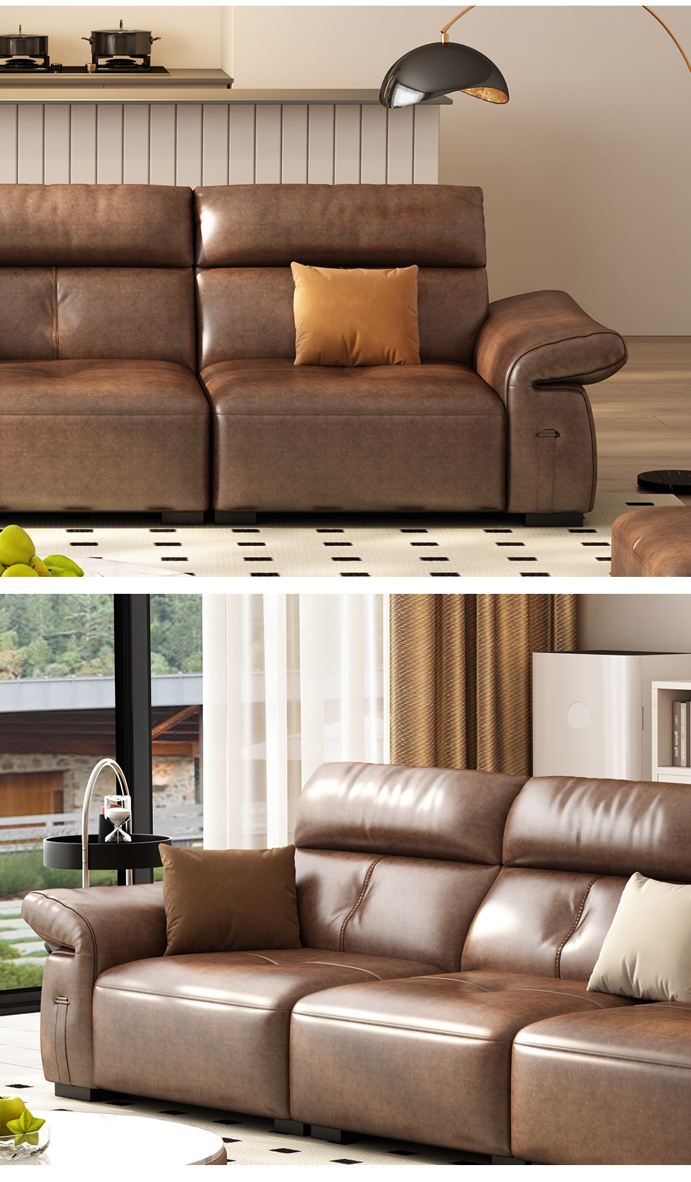 B系优选 现代简约 接触面头层黄牛皮+仿皮 E1级夹板+松木框架 无粉海绵 靠包赛羽绒+公仔棉填充 样色 直排3.2米四人位 皮艺沙发¥8155