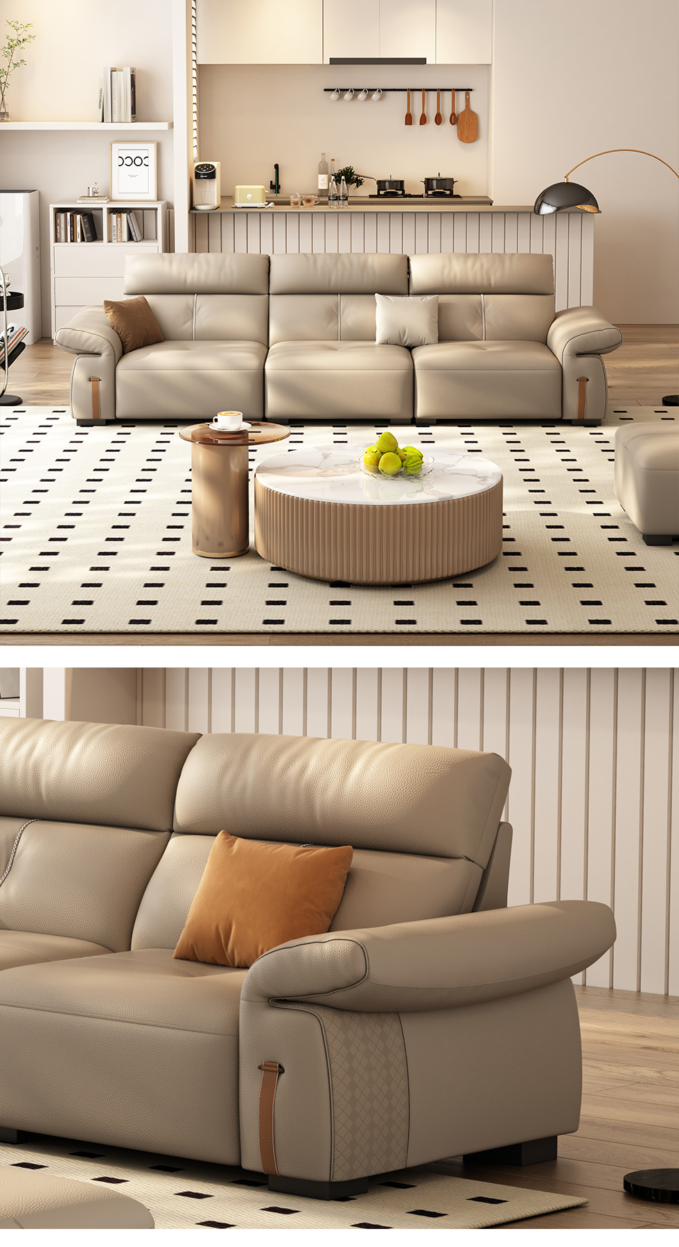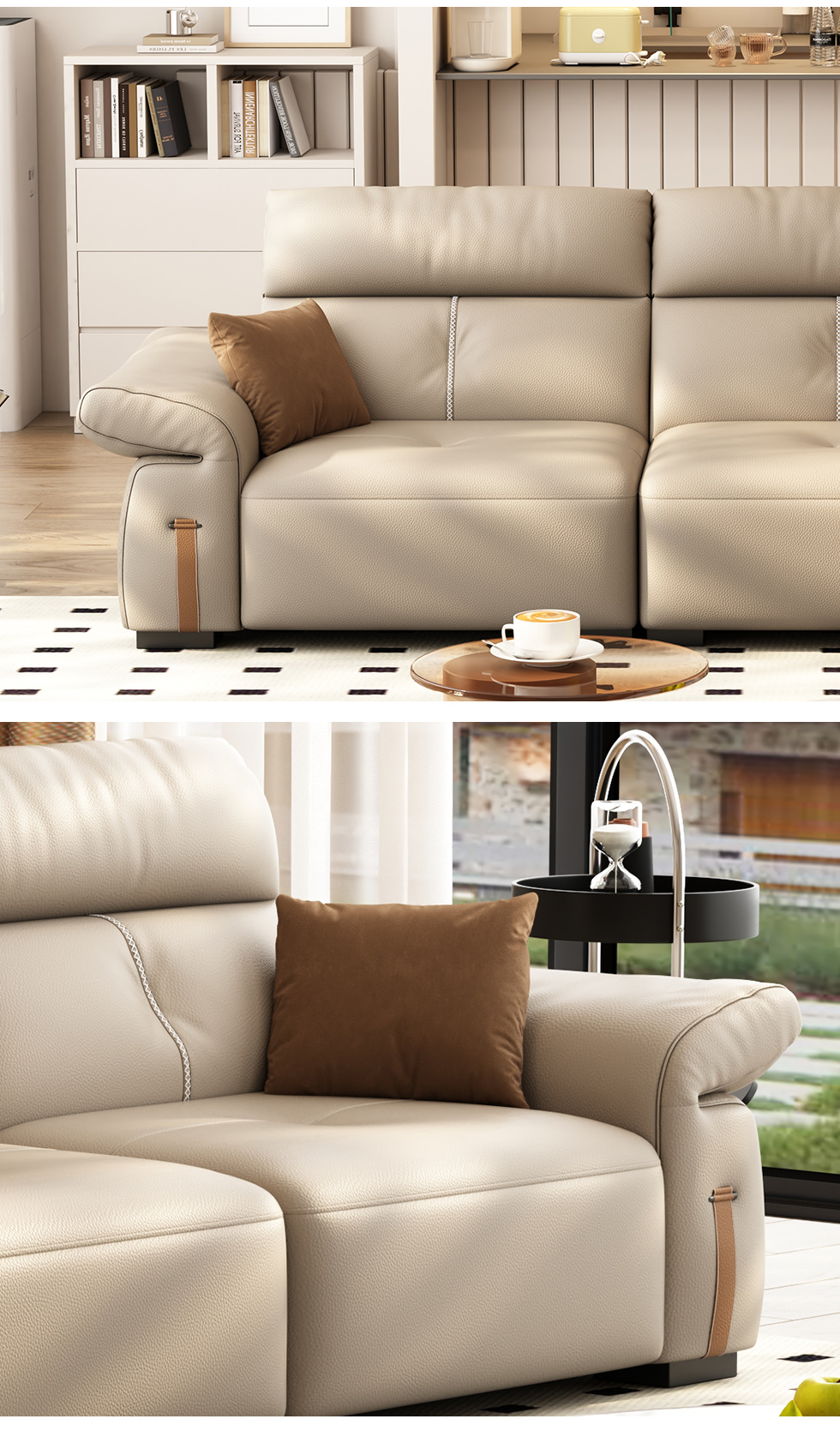 B系优选 极简,极简 接触面头层牛皮+仿皮+多层实木板+实木内架+高回弹海绵+实木5分脚 米黄色 大四位 3.44米沙发
