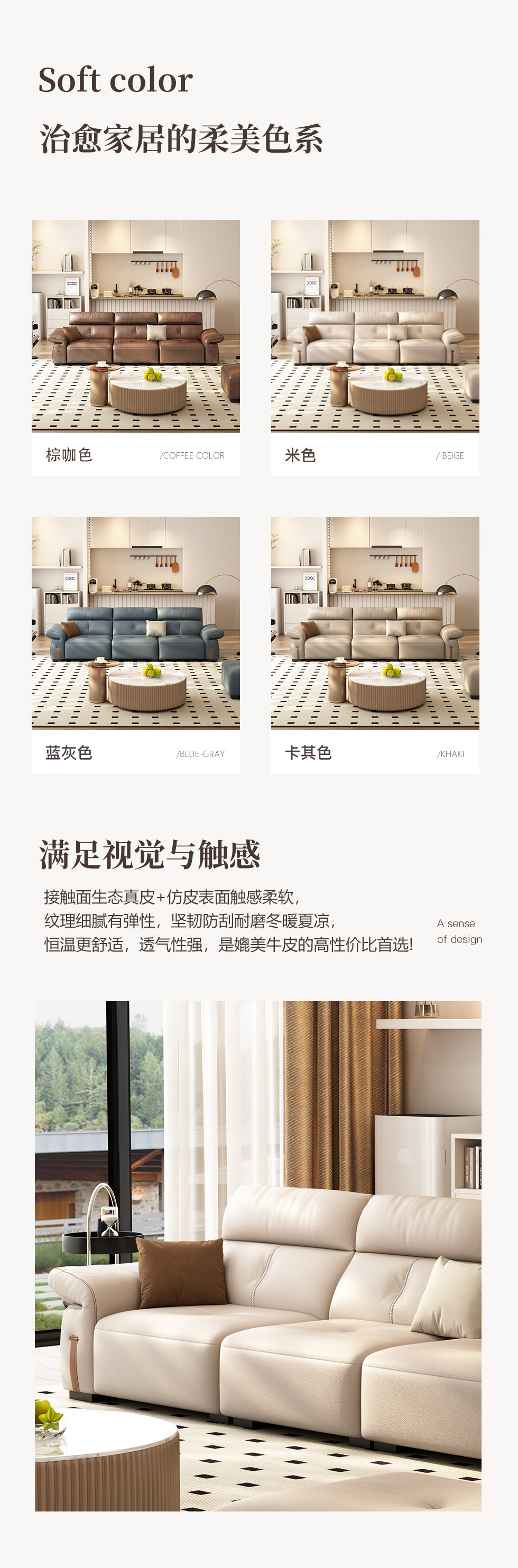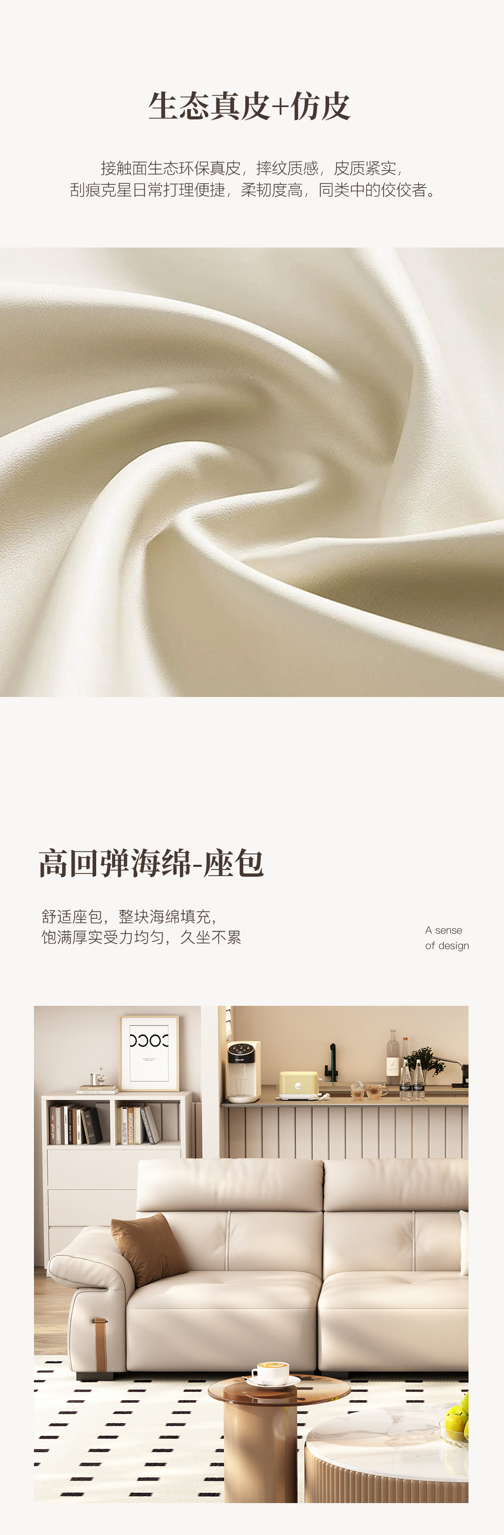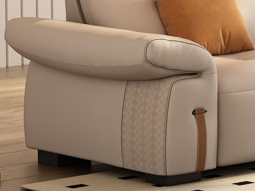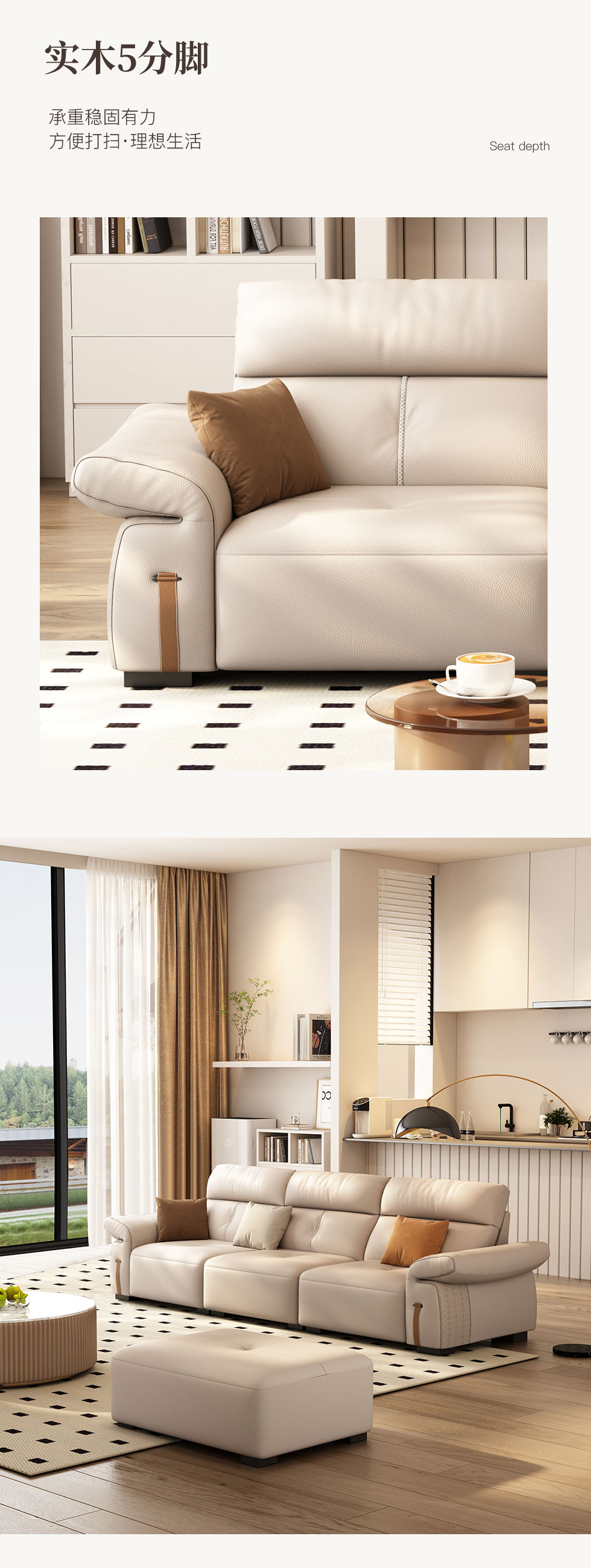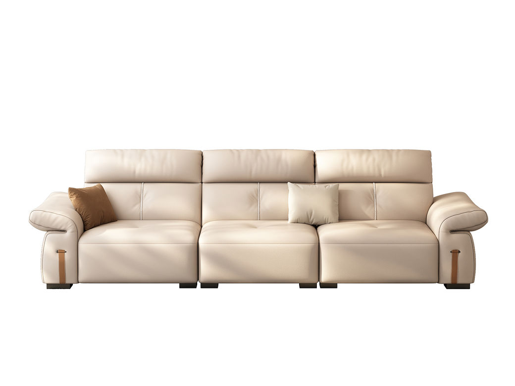 非凡工艺 极简 生态真皮+仿皮+多层实木板+实木内架+高回弹海绵+实木5分脚 米色 直排四位 2.85米沙发