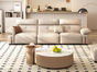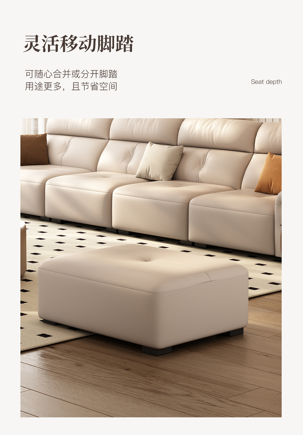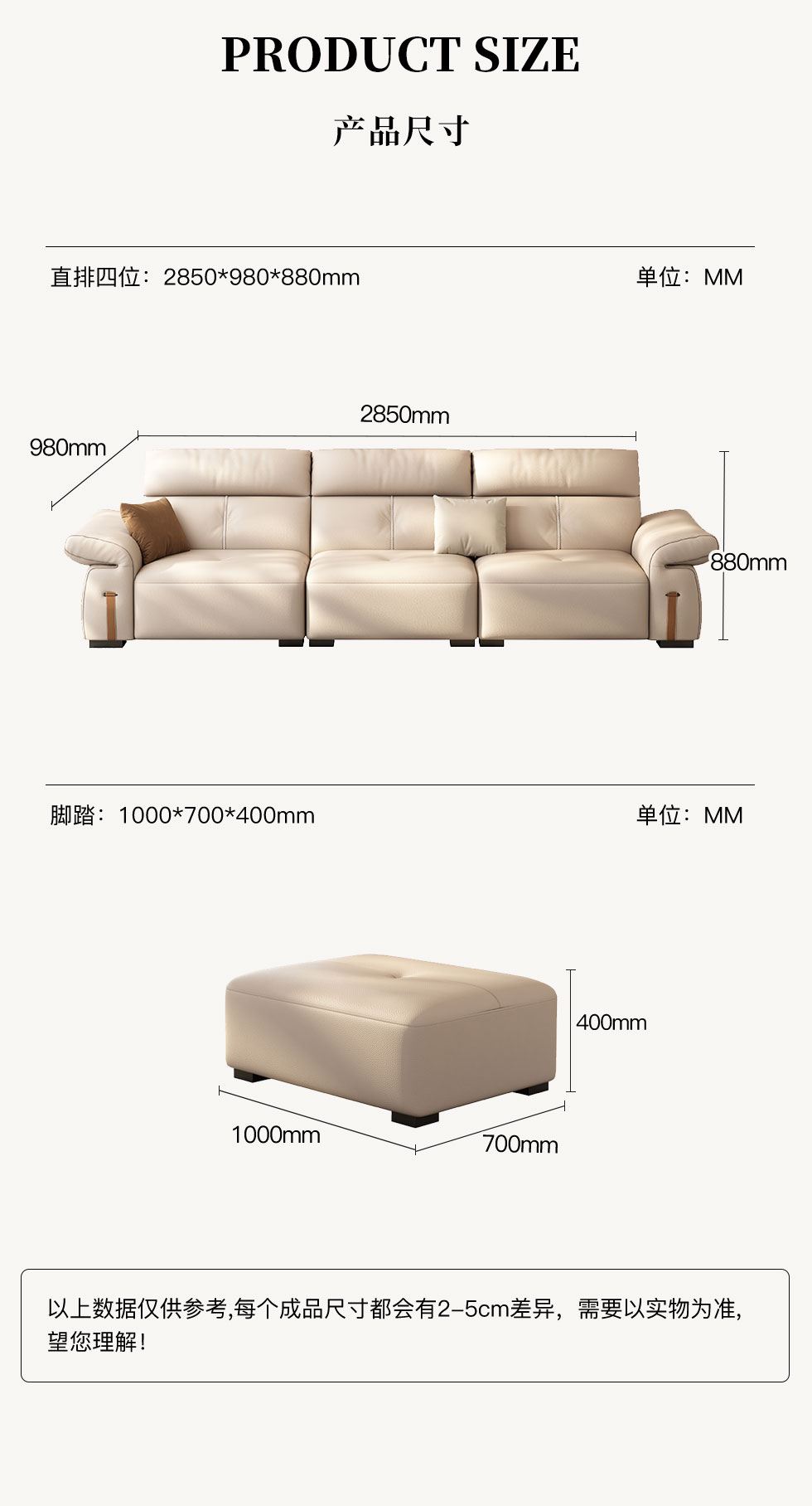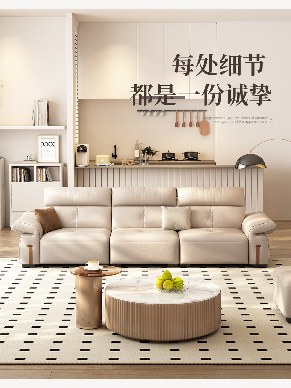非凡工艺 极简 生态真皮+仿皮+多层实木板+实木内架+高回弹海绵+实木5分脚 米色 直排四位 2.85米沙发