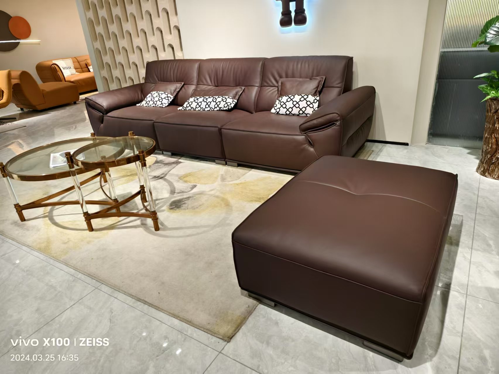 B系优选 极简 接触面头层牛皮+仿皮+多层实木板+实木内架+高回弹海绵+实木5分脚 咖色 直排四位 3米沙发 |