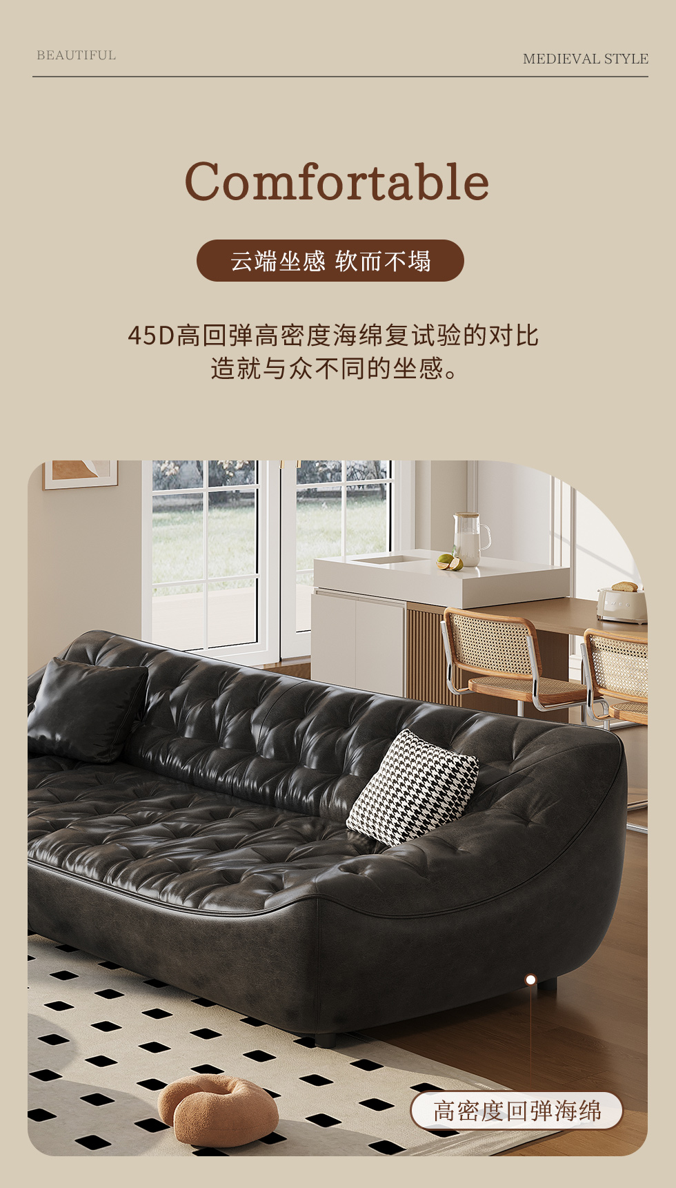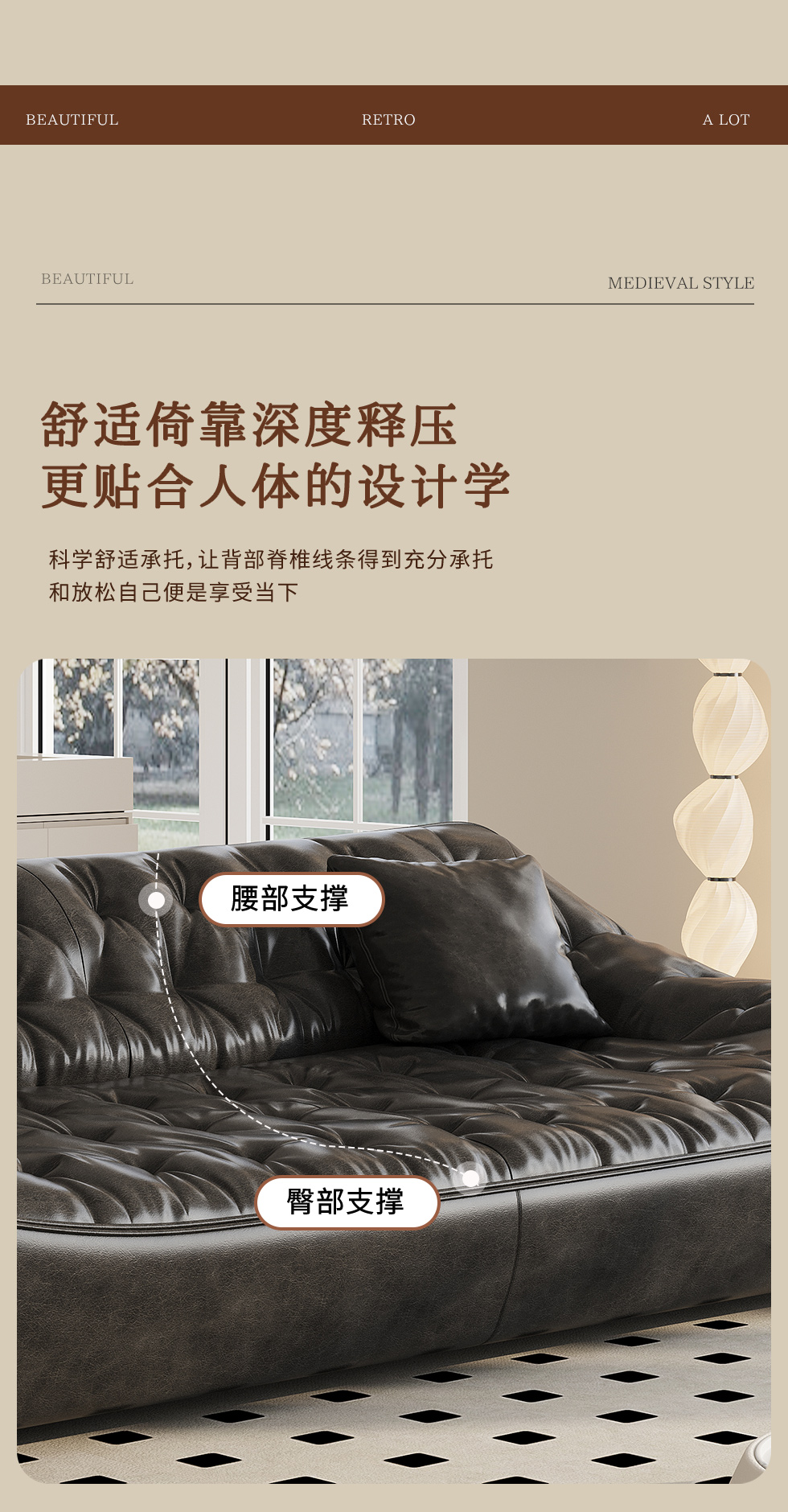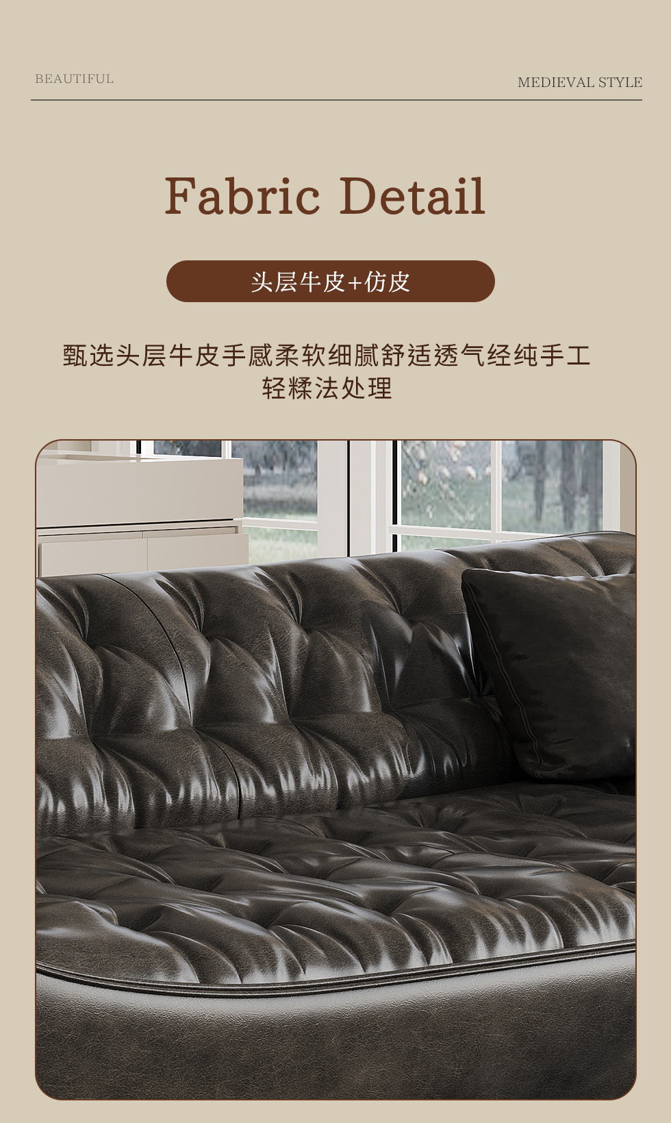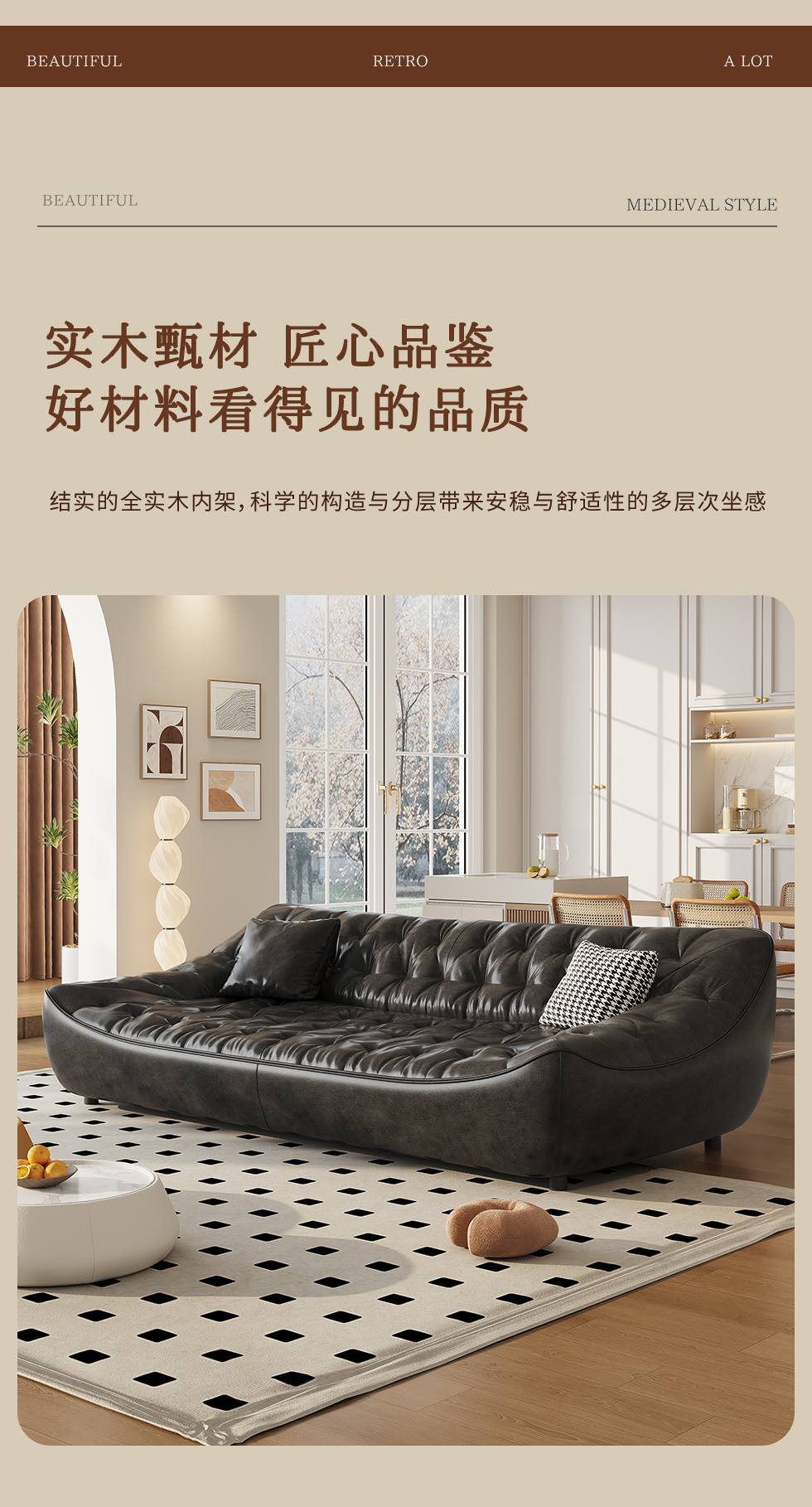 中古·尚 网红 中古风 接触面头层牛皮+框架落叶松木+多层实木夹板+实木脚 2.85米四人位 分体 沙发