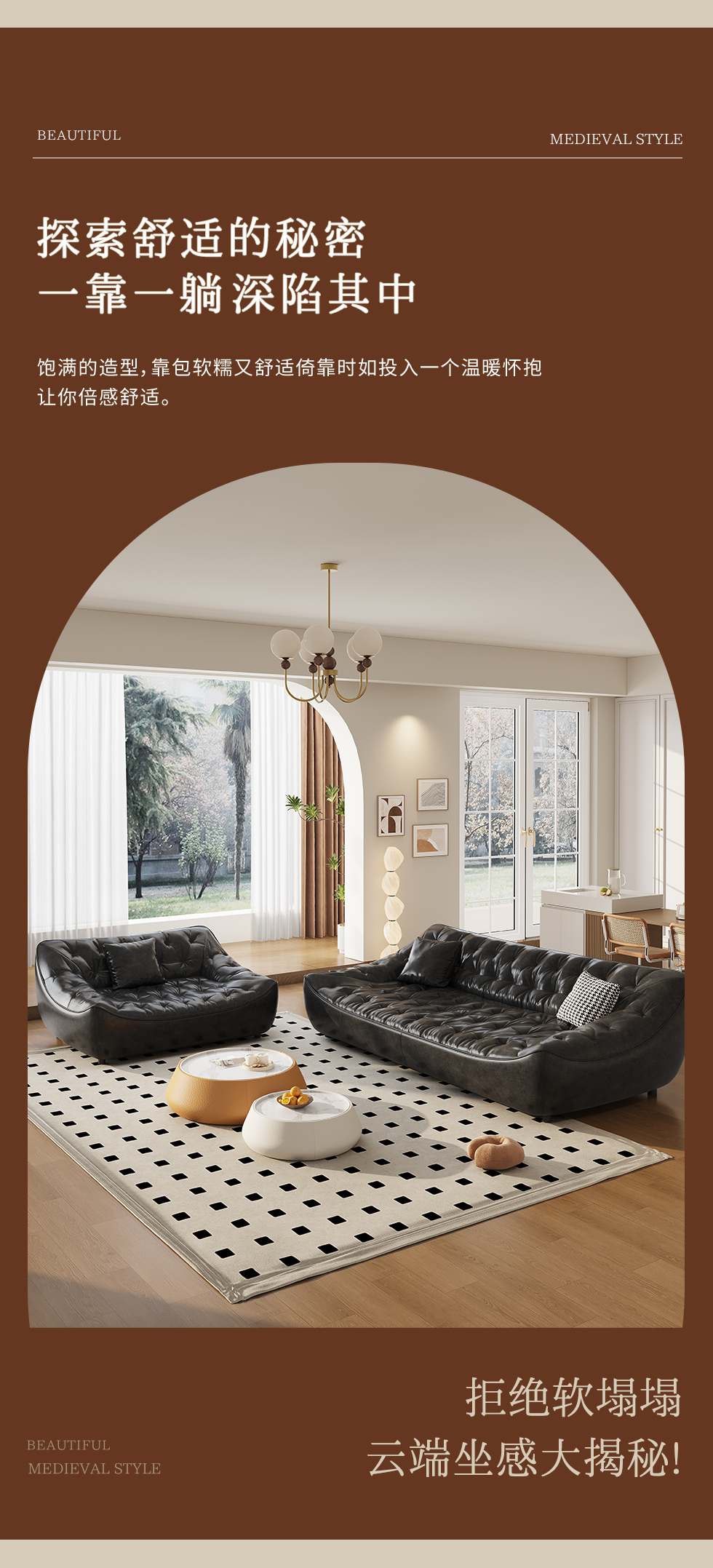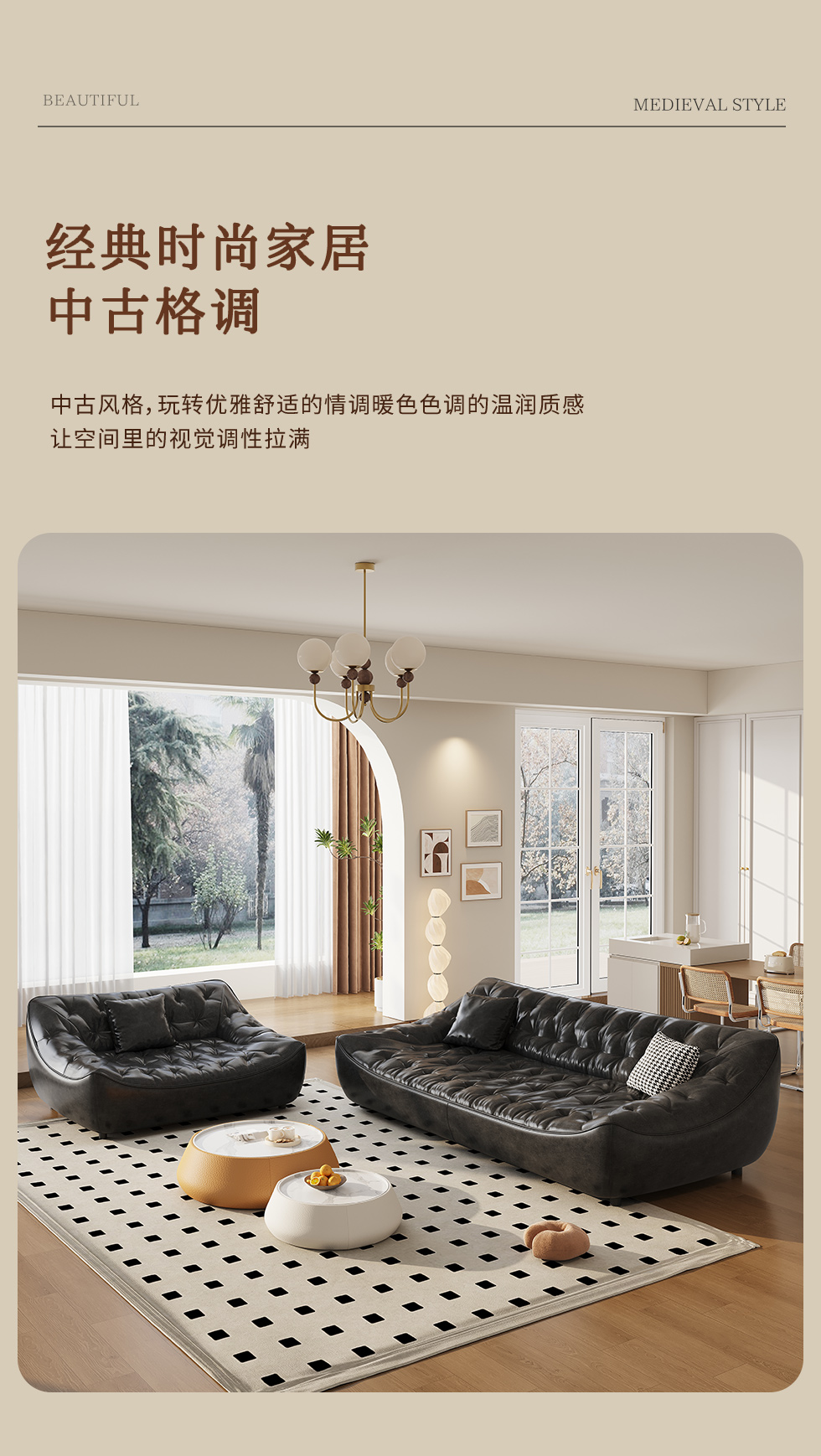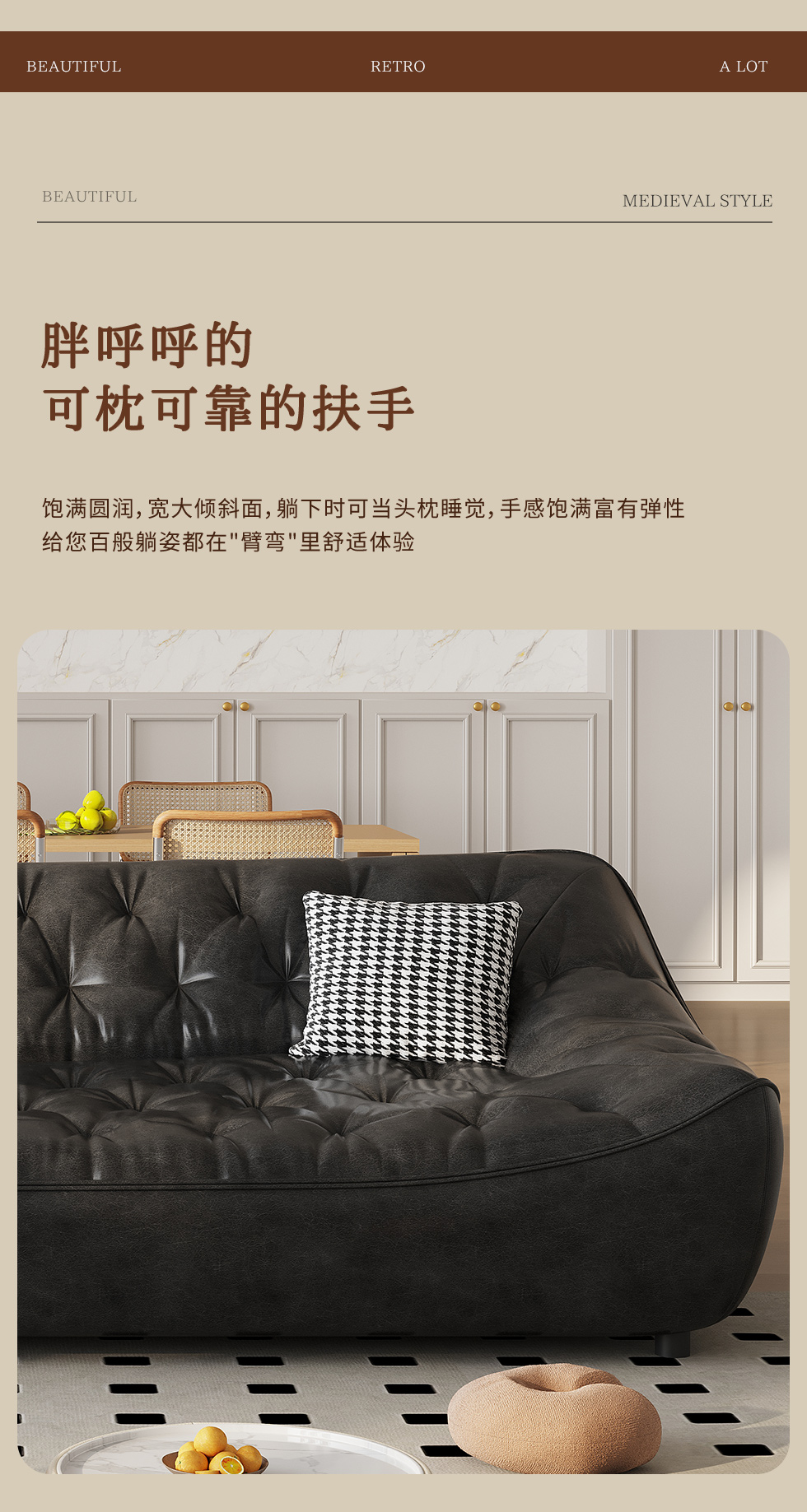 中古·尚 网红 中古风 接触面头层牛皮+框架落叶松木+多层实木夹板+实木脚 2.85米四人位 分体 沙发