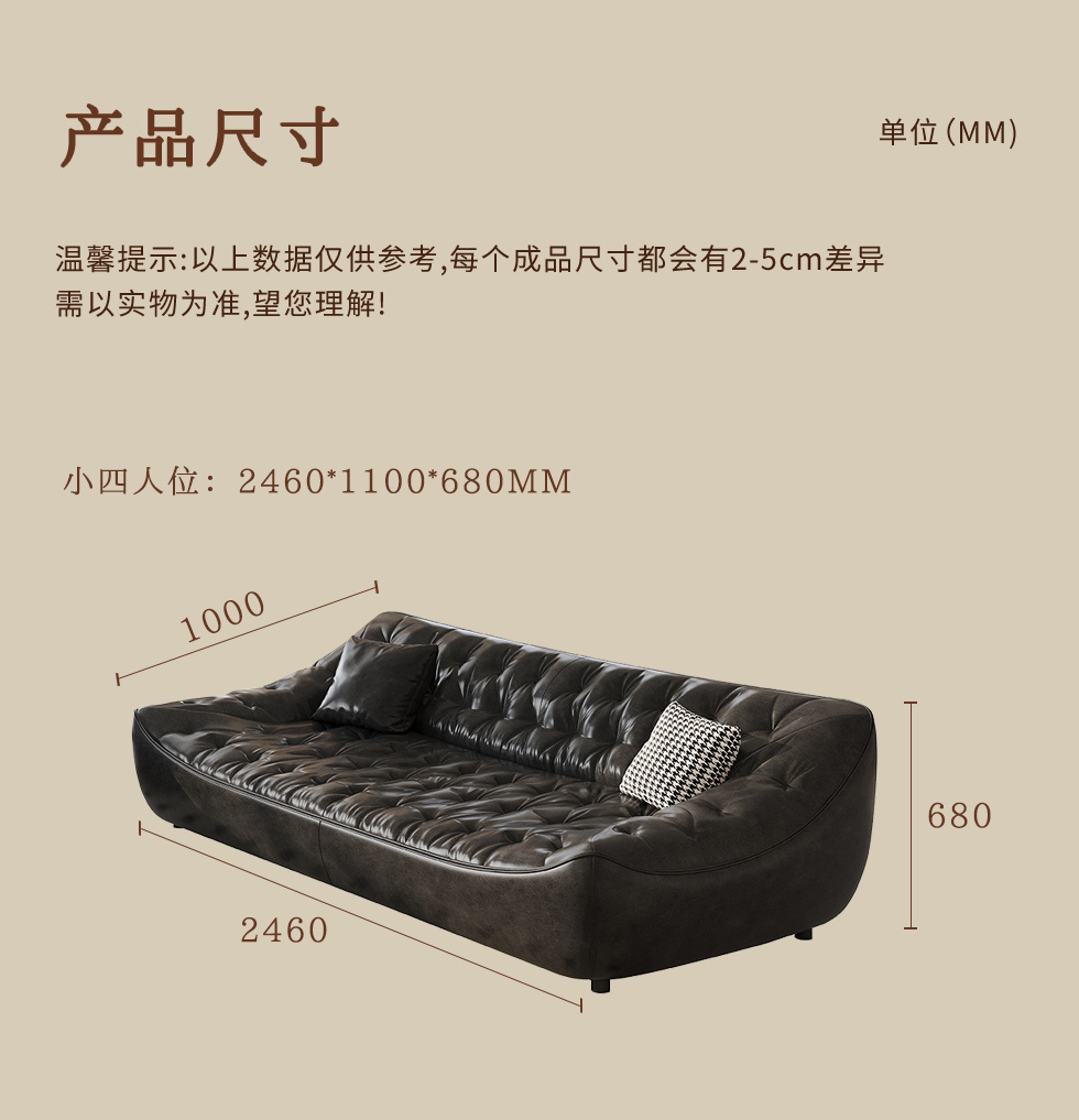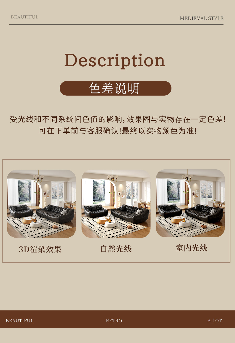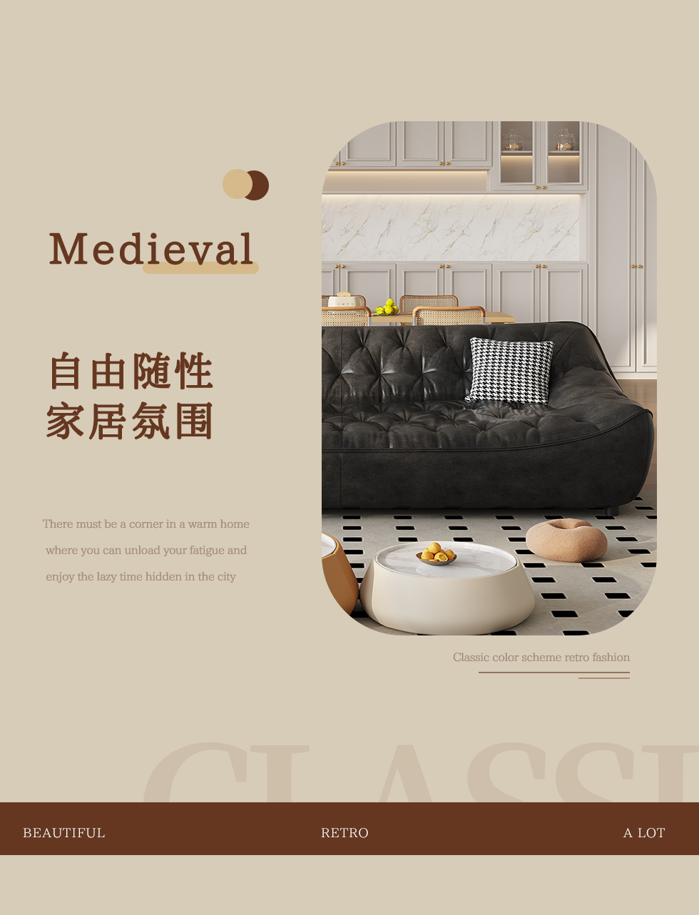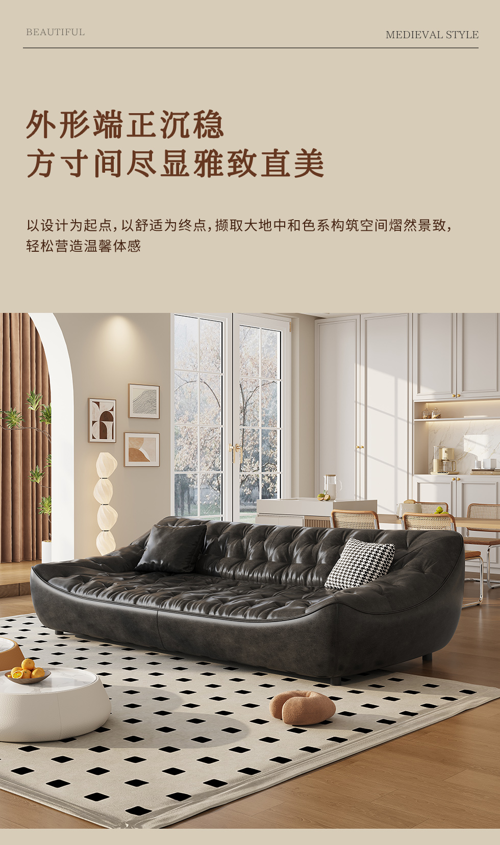 中古·尚 网红 中古风 接触面头层牛皮+框架落叶松木+多层实木夹板+实木脚 2.85米四人位 分体 沙发